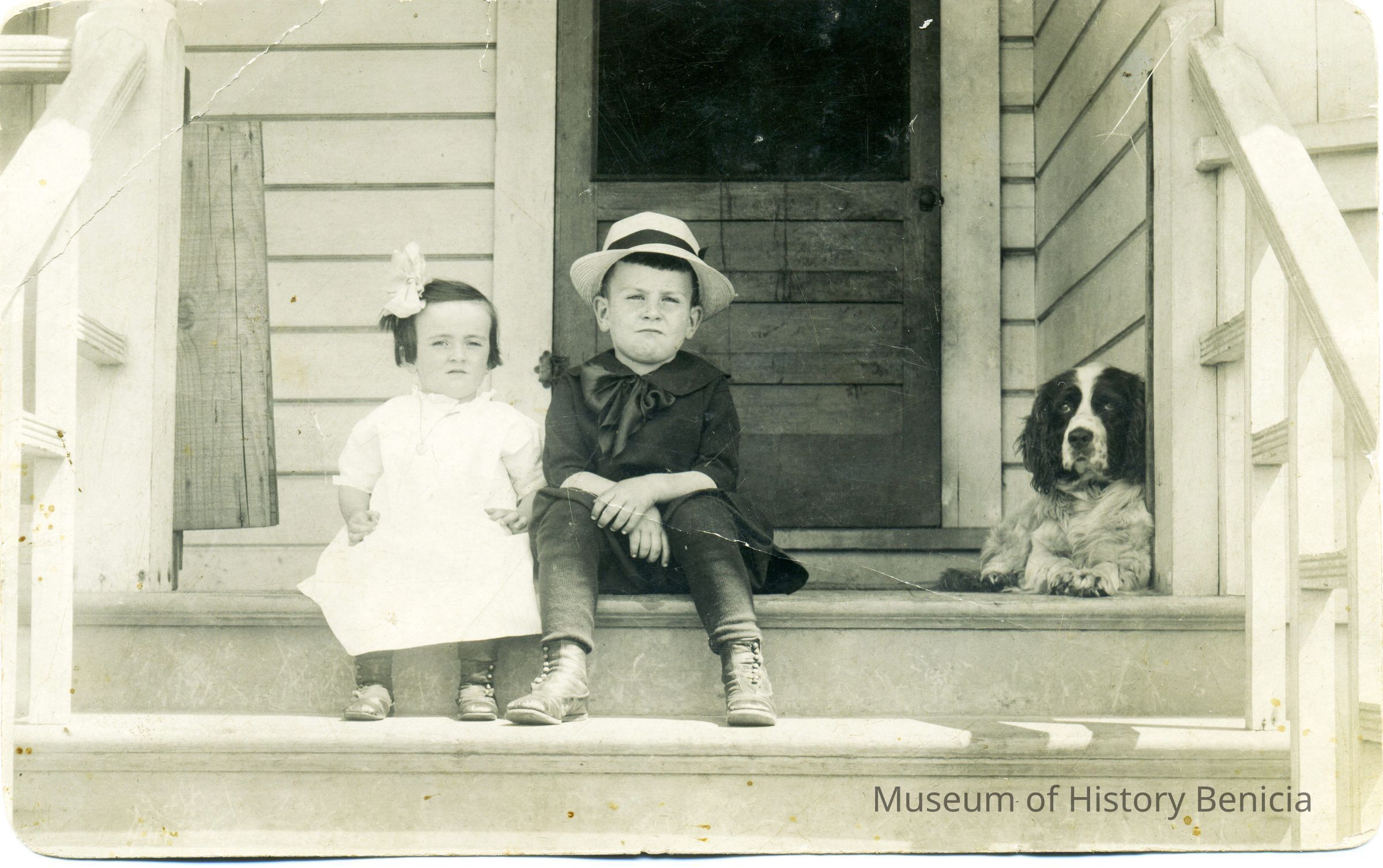 This is a real photo postcard of two children sitting on the front steps with a dog. The back says they are Ella and Bert Higgins at home at 622 East 2nd St. Benicia. The postcard is a divided back postcard (post 1907). It is printed on AZO paper with the four arrows in the corners of the stamp box pointing up (1904-1918). This card was probably printed between 1907 and 1918.