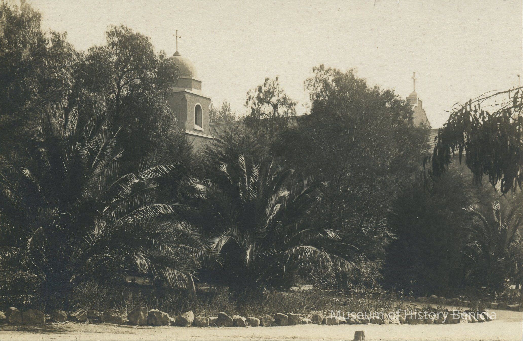 B/W Postcard - The grounds of St. Catherine's Academy; part of the chapel is visible behind the trees.