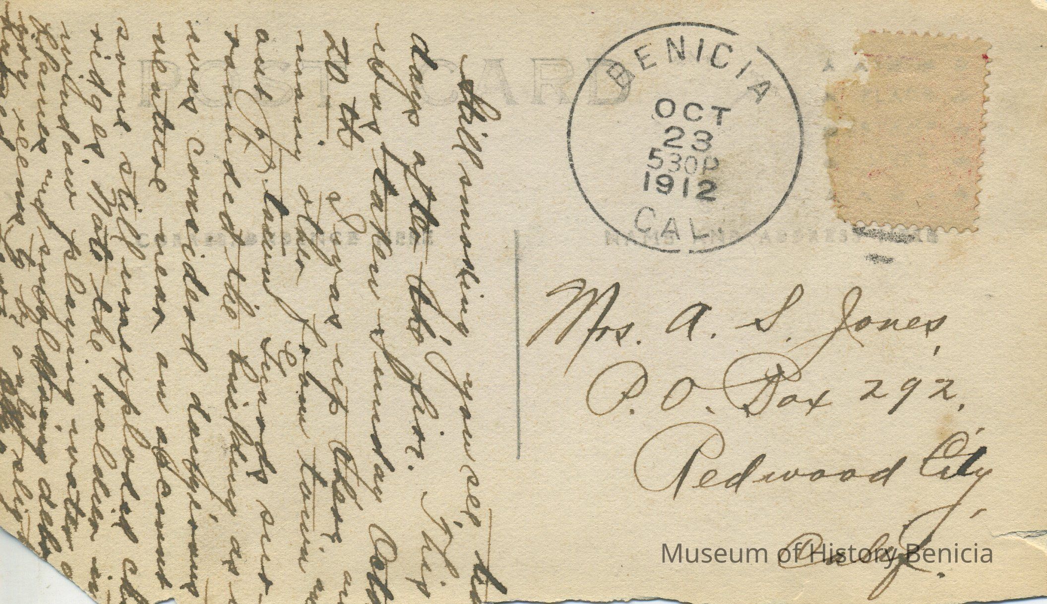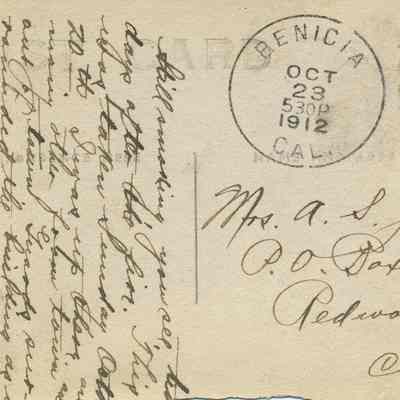 The card was sent from Benicia in October 1912 by a person named Olga to a Mrs. A. S. Jones in Redwood City, CA.