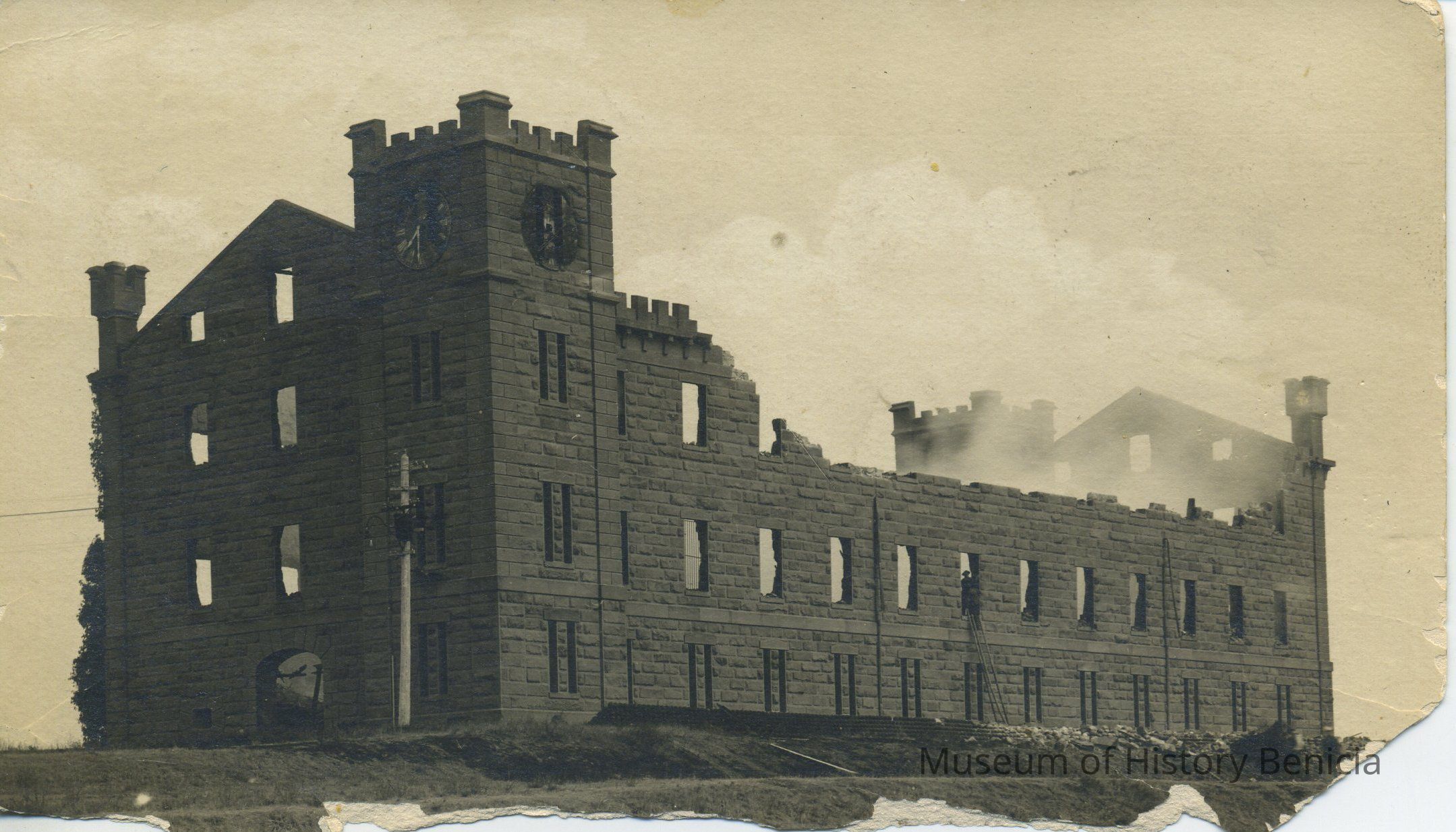 B/W Postcard of the Benicia Arsenal Clock Tower shortly after the explosion and fire.