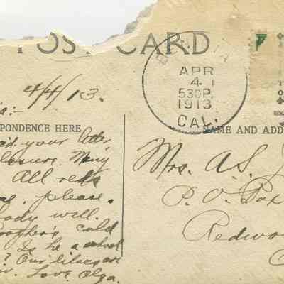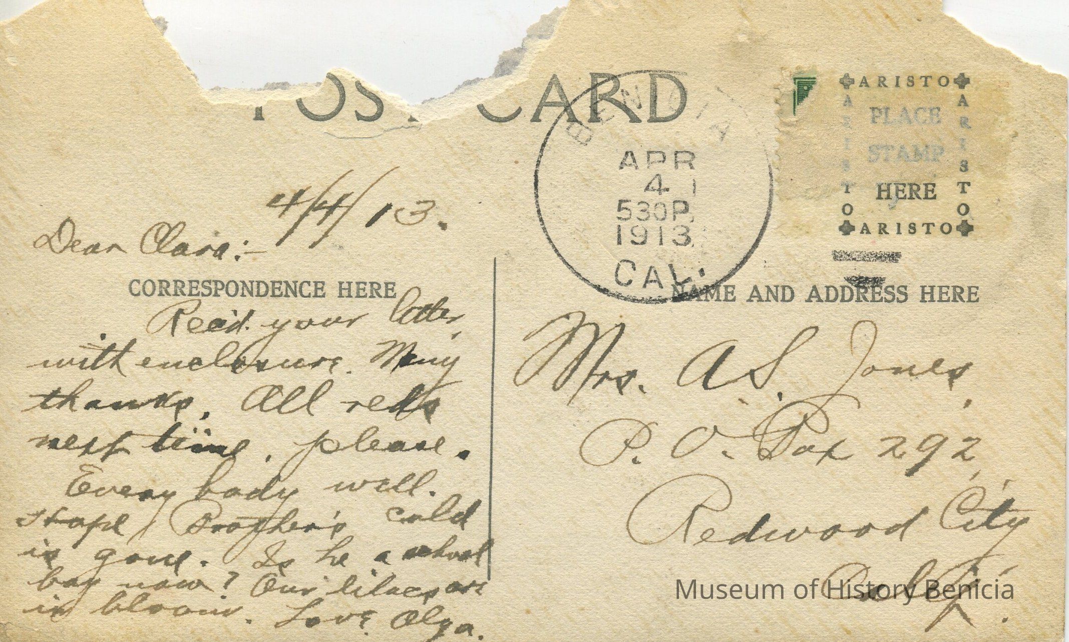 The card was sent from Benicia in April 1913 by a person named Olga to a Mrs. A. S. Jones in Redwood City, CA. The card is in poor condition.