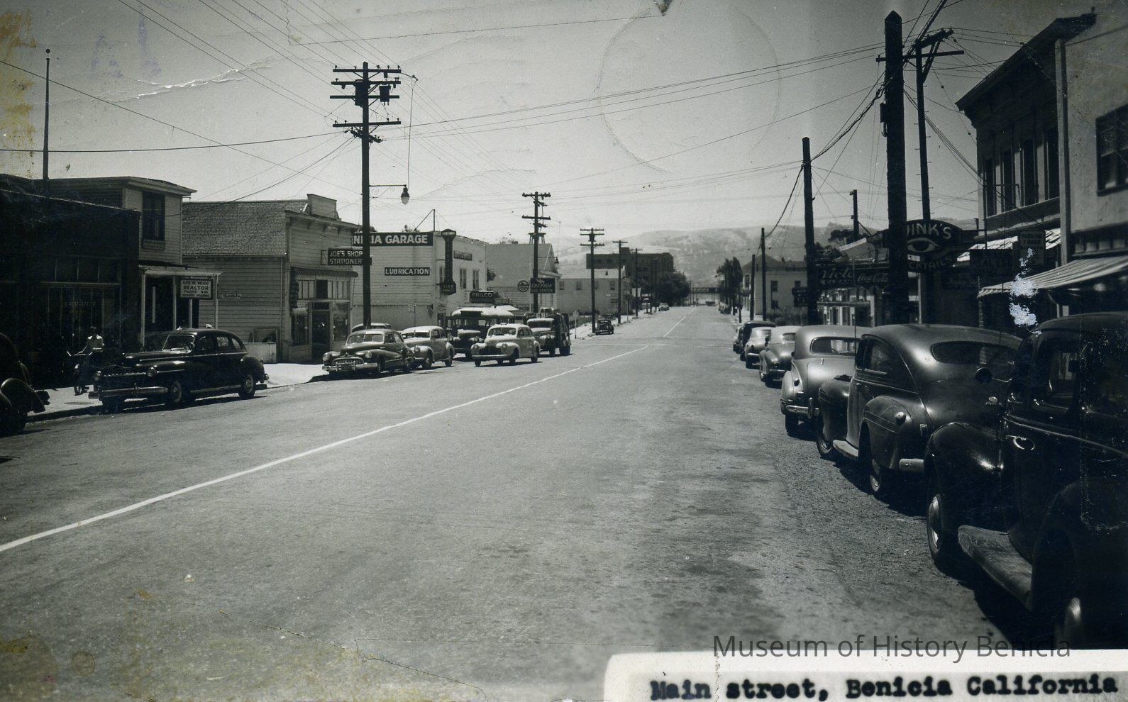 B/W photo on a postcard of Main Street, Benicia California, looking southward, circa 1949