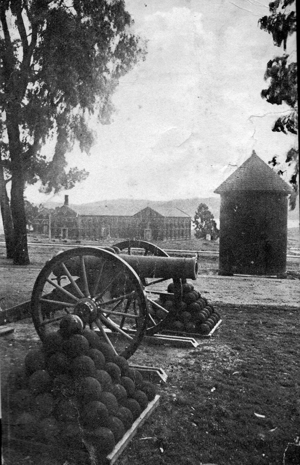 B/W Benicia Arsenal buildings 55, 56, 57 behind cannon and cannonballs.