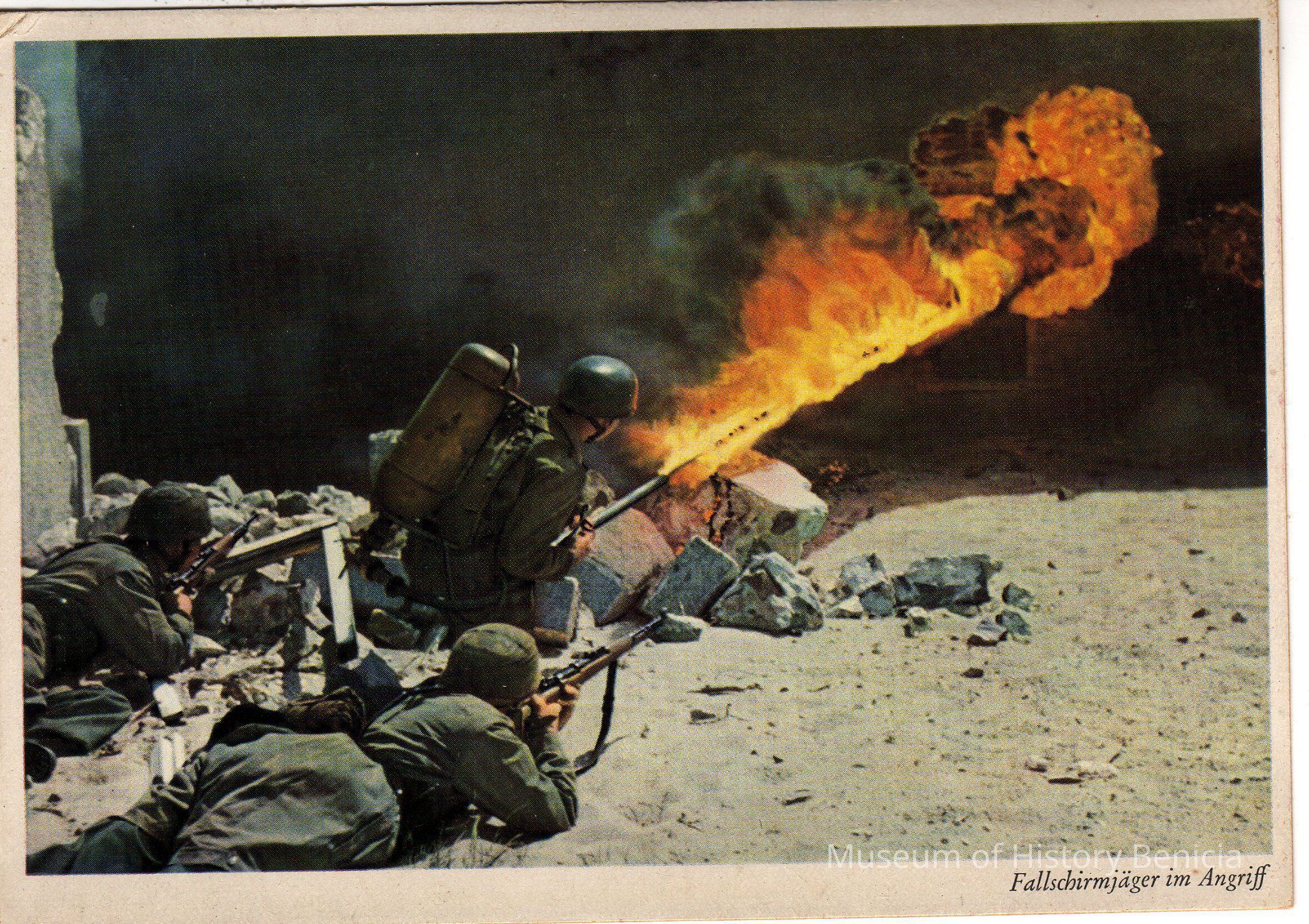photo: three soldiers: two w/rifles, one w/flame throwerCollection