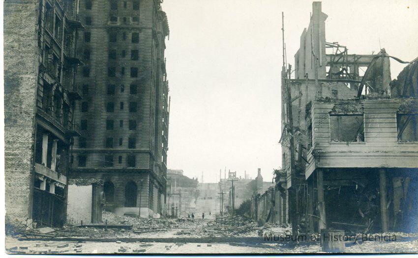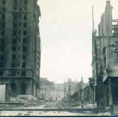 Postcard of buildings and destruction in SF after the 1906 earthquake. (The street rises in the distance similar to how California street looks today.) It is an undivided back real-photo postcard. Stamp design is a plain.Collection