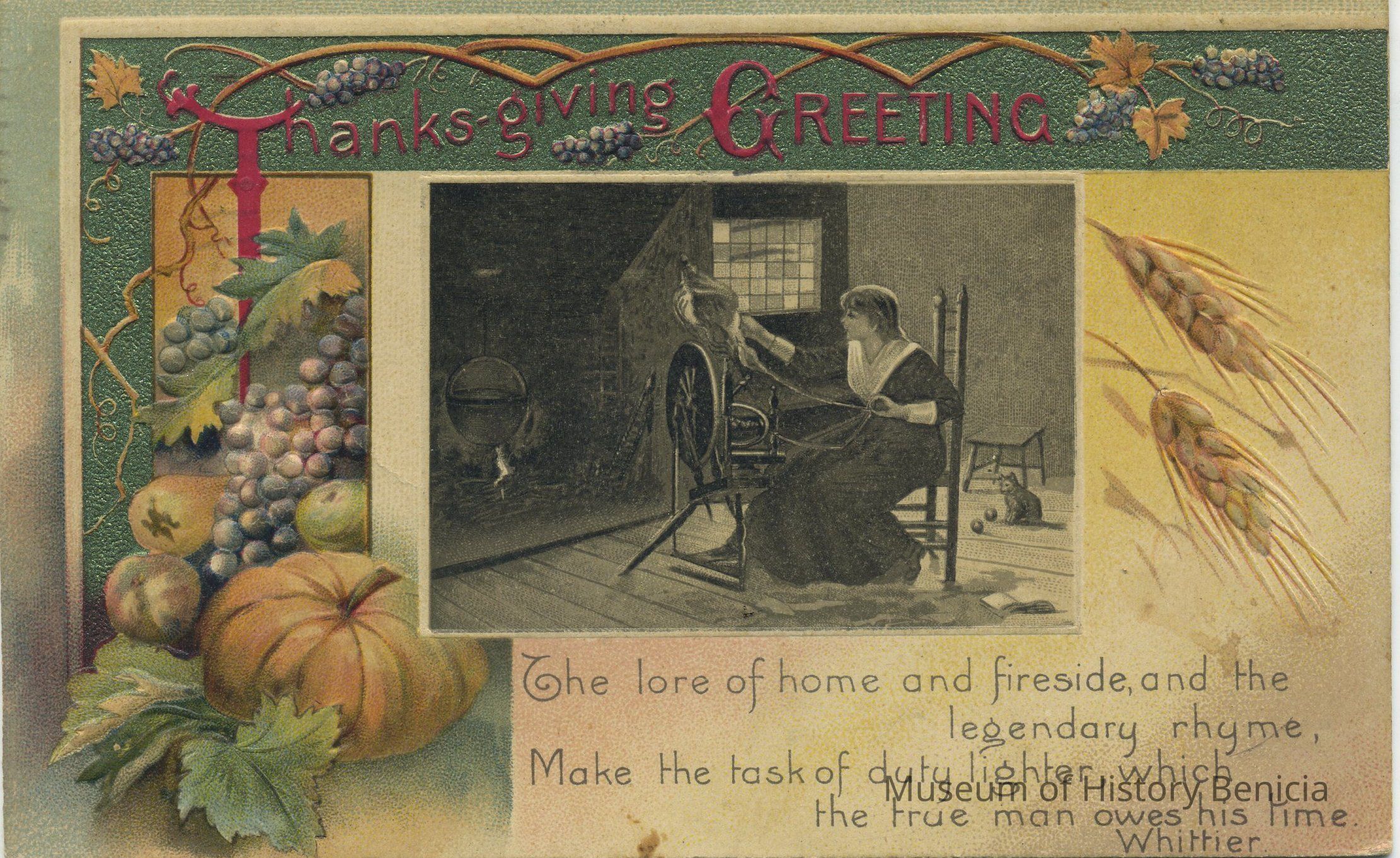 Front: "Thanksgiving / Greetings"; in center is a B/W lithograph of a woman at a spinning wheel; there are fall fruits and vegetables at the left; near the bottom is a verse: