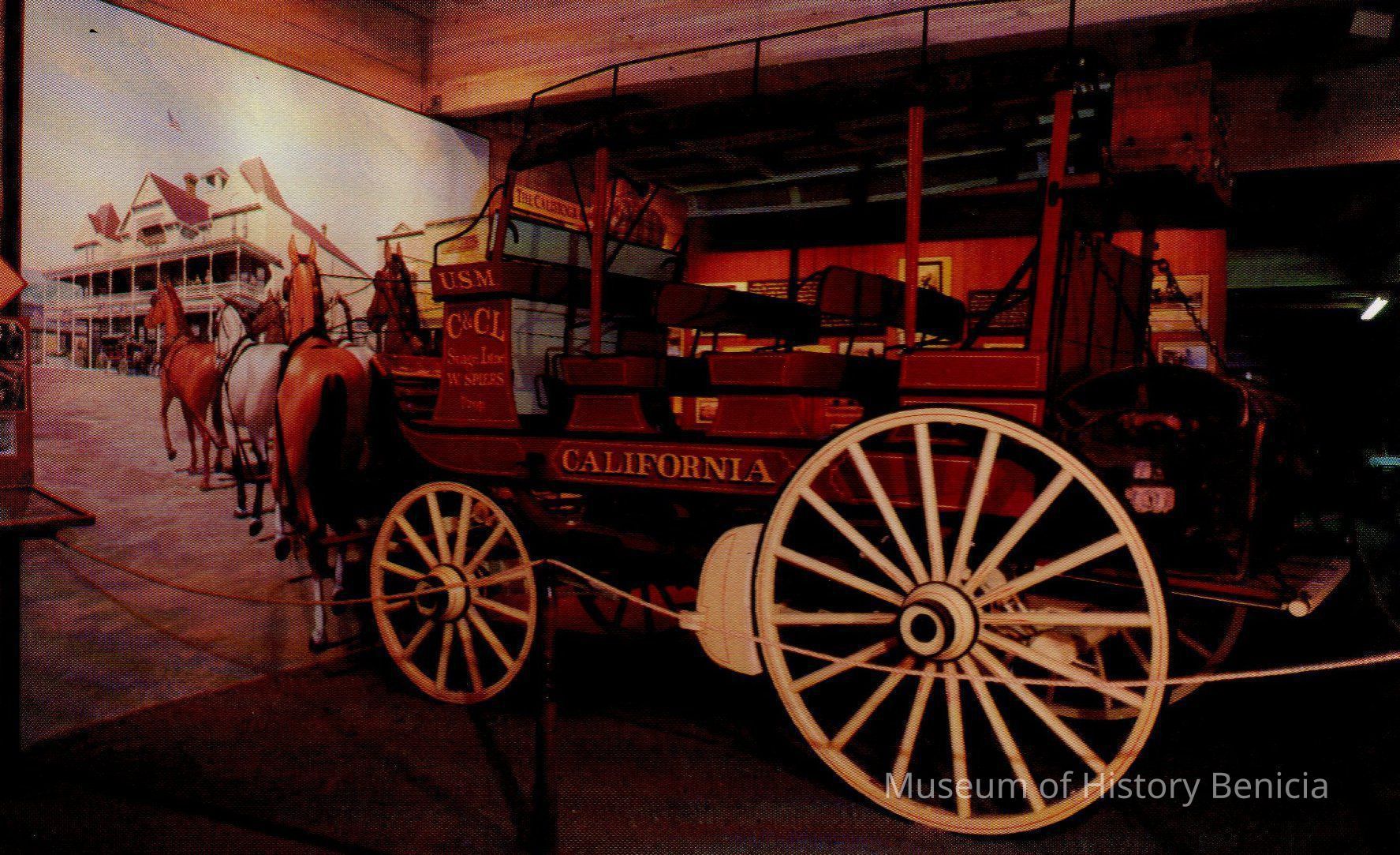 Caption on back: A dozen stage coaches carried travelers from the railroad terminus to points beyond, serving quick-silver mines and resorts, returning to Hotel Calistoga. Horses painted by A. Kendall O'Connor. Hotel and background by Steve Della Maggiora. One of the many dioramas in the Sharpsteen Museum. printed by the Calistoga Museum Auxilliary.Collection