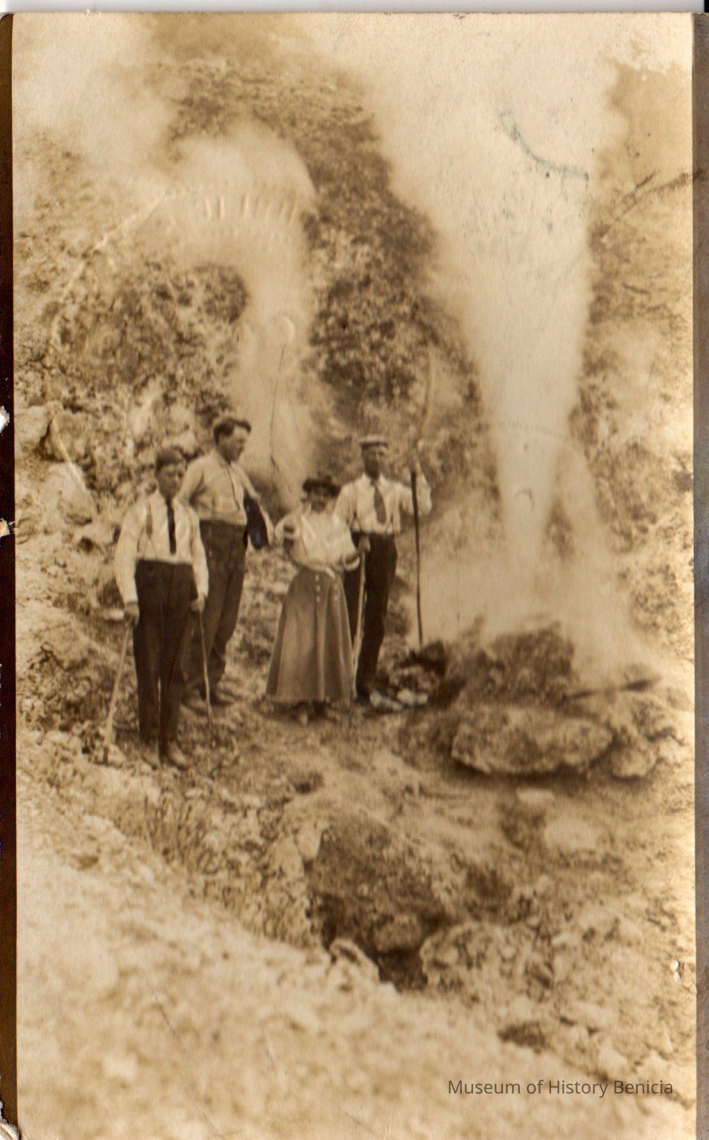 Woman and three men standing by a geyser. Addressed to Mr. W.L. Crooks (papa) from Mabel Crooks.