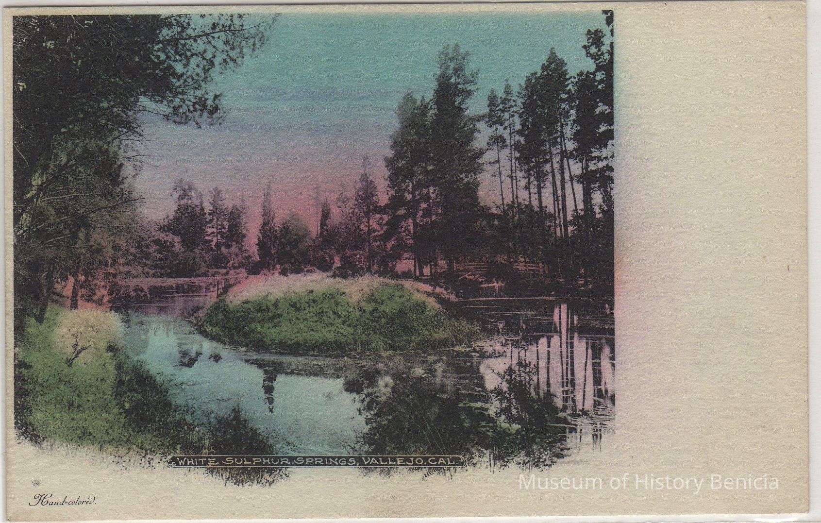 B/W ("hand-colored" noted in lower left corner) photograph on a postcard of scene at White Sulphur Springs in Vallejo, CA.
