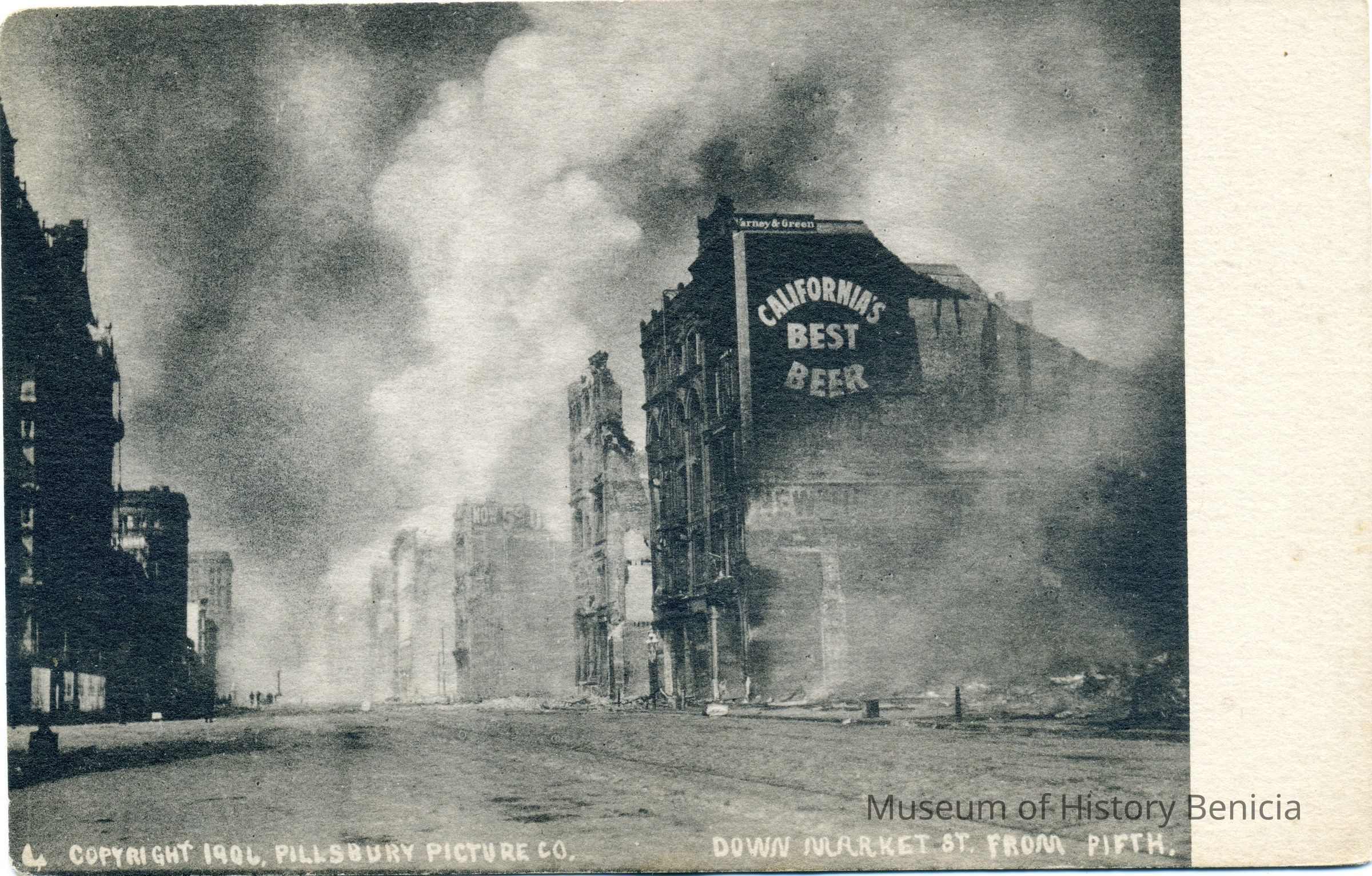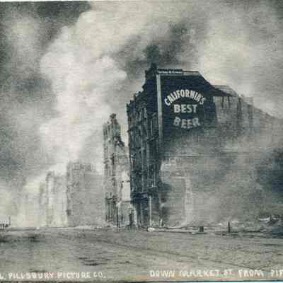 Postcard of San Francisco fire after the 1906 earthquake. It is looking down Market street from 5th street. It was published by the Pillsbury Picture Co. It is postally unused and has an undivided back with the inscription "This side for address".Collection