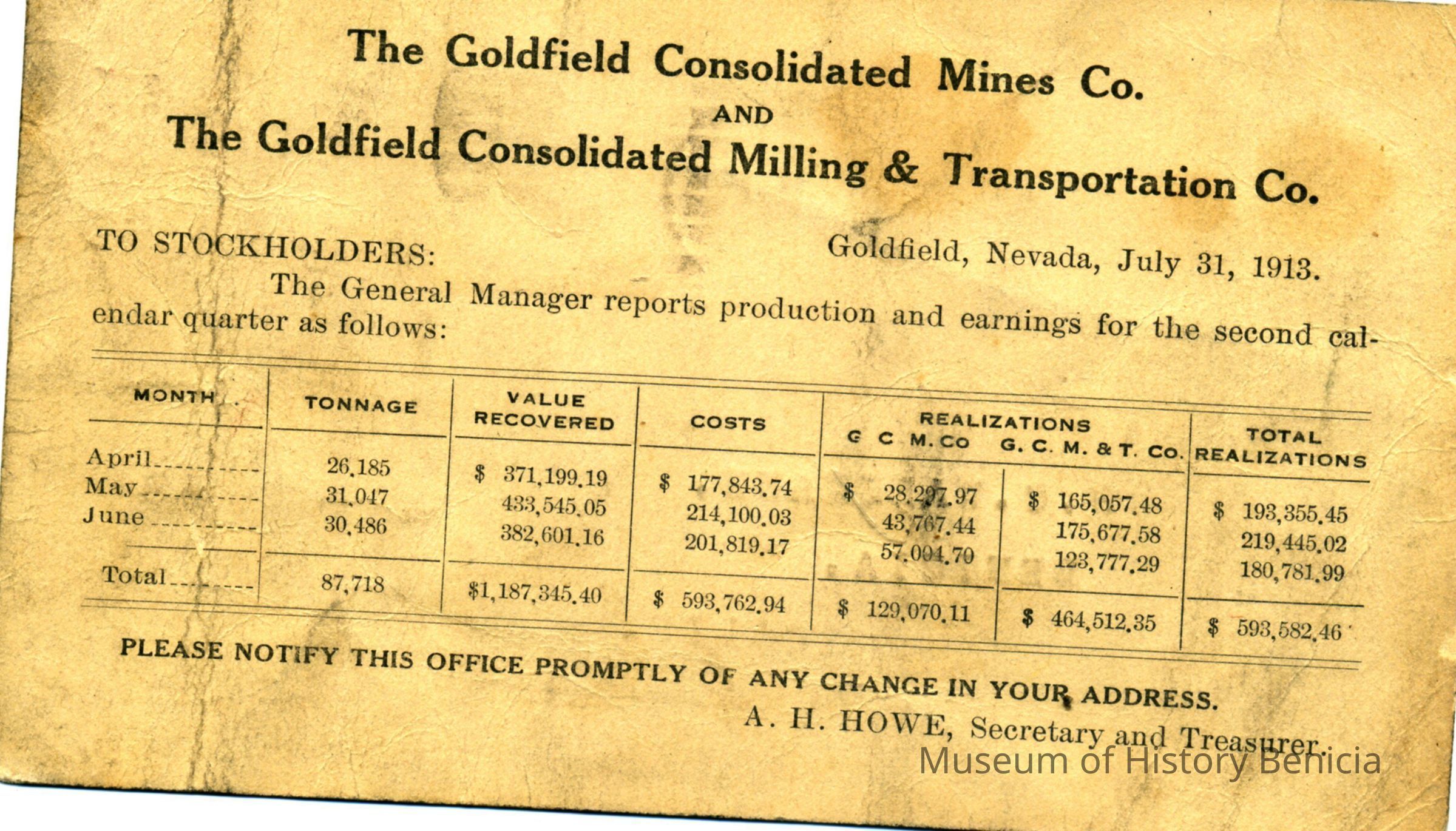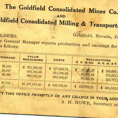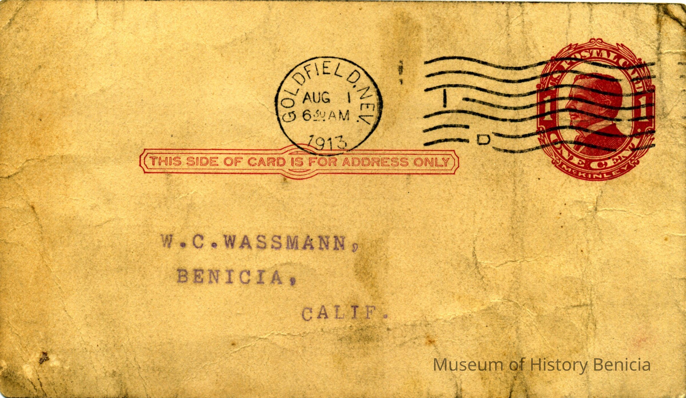This is a post card from the Goldfield Consolidated Mines to its shareholders. It is dated 08/01/1913 and is addressed to W.C. Wassmann (Walter Wassmann).