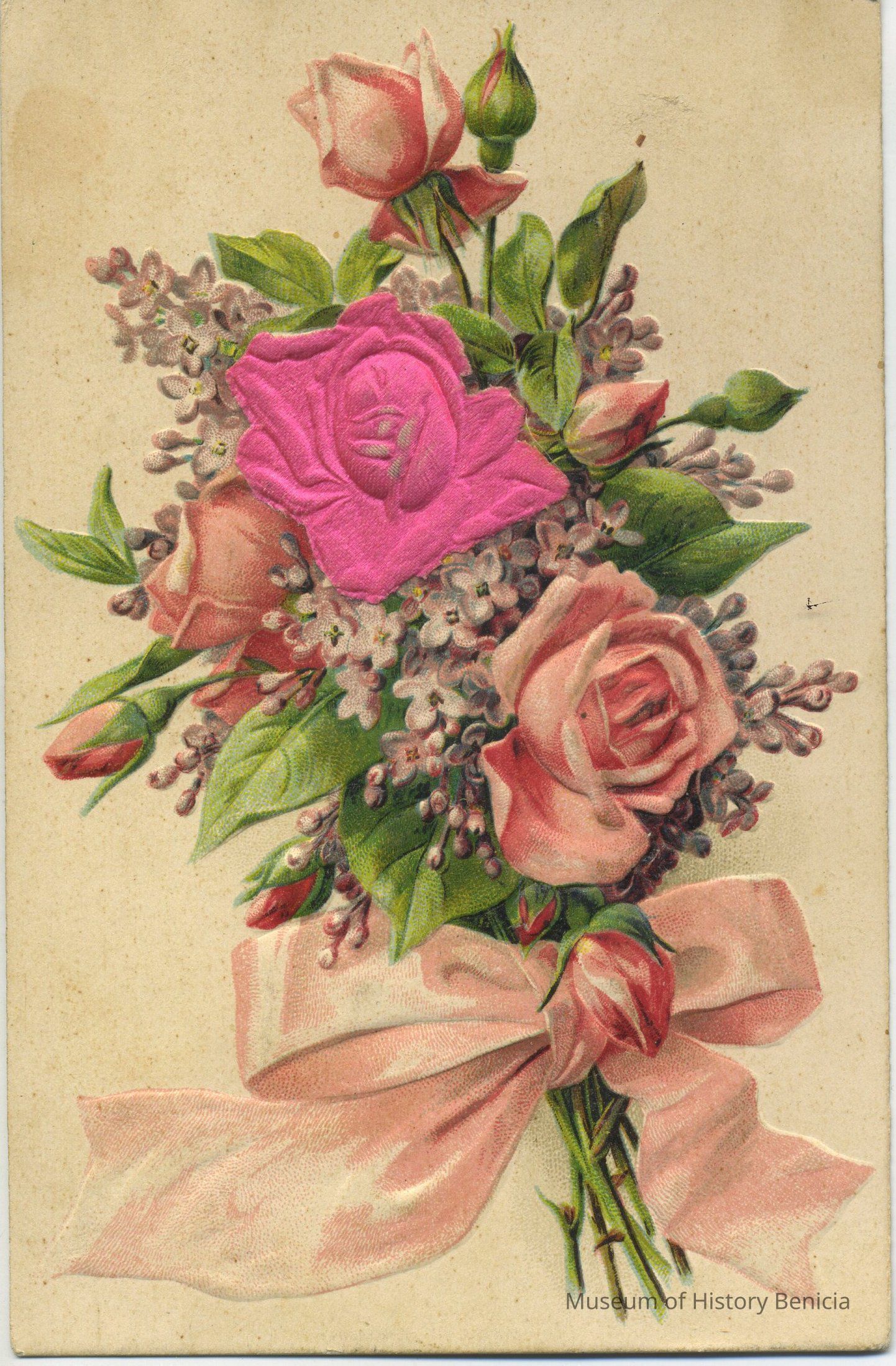 Front: Bouquet of Roses and lilacs tied with a pink ribbon;