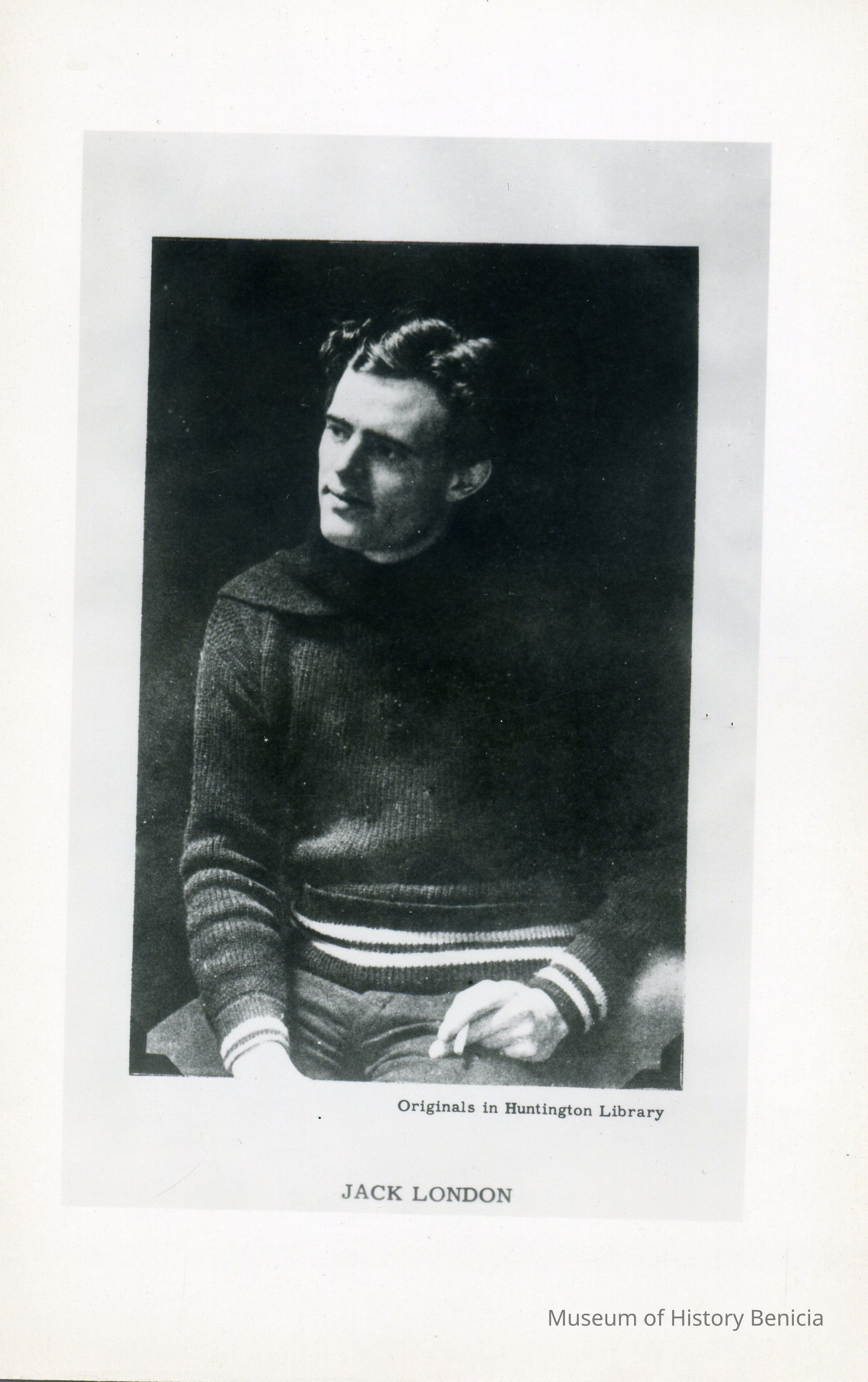 B/W photograph/portrait of Jack London on a postcard. Same portrait as BHM 04.11.232
