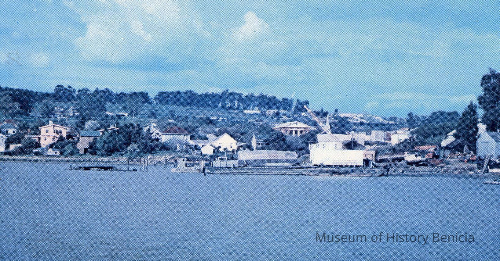Color Photograph on a postcard of part of Benicia's shoreline; Garske's old boatyard in at the center; the roof of the Capitol Building is also visible above the trees near the center;