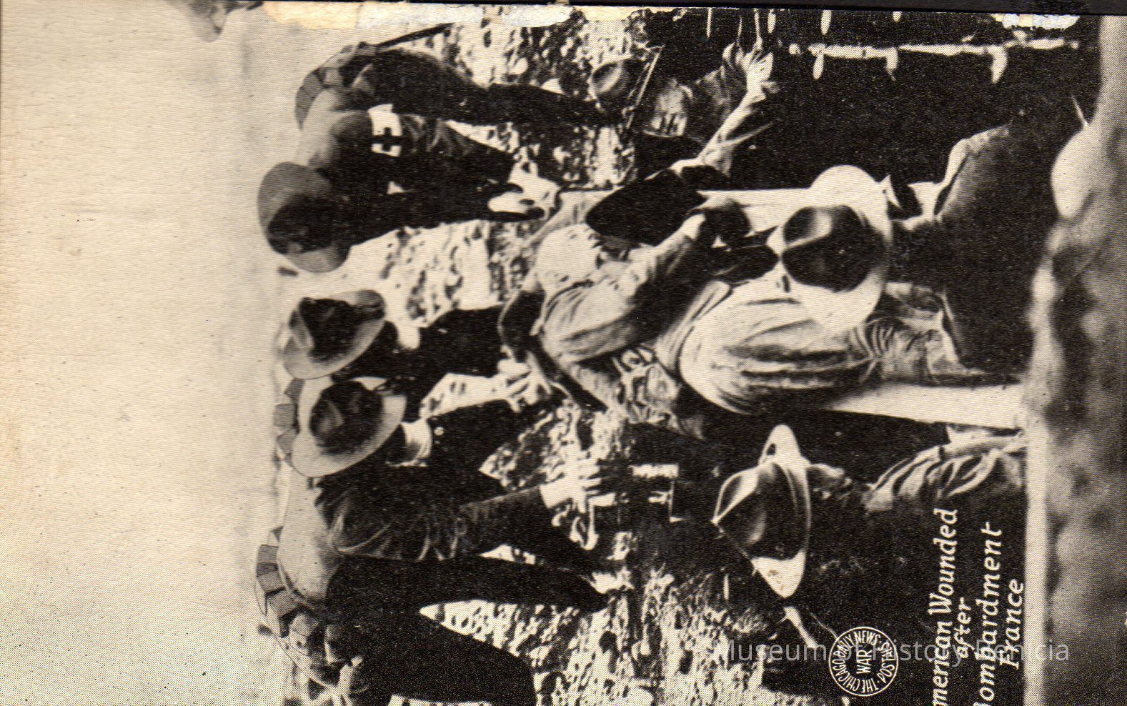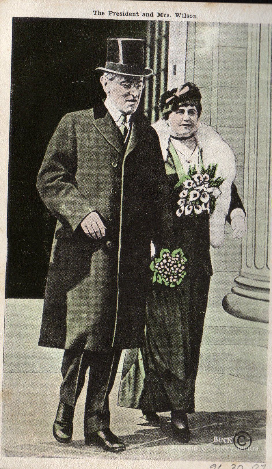 two postcards attached (back to back) on black paper. One side shows a couple labeled "The President and Mrs. Wilson" the other "American Wounded after Bombardment France/Chicago Daily News War Postals"Collection