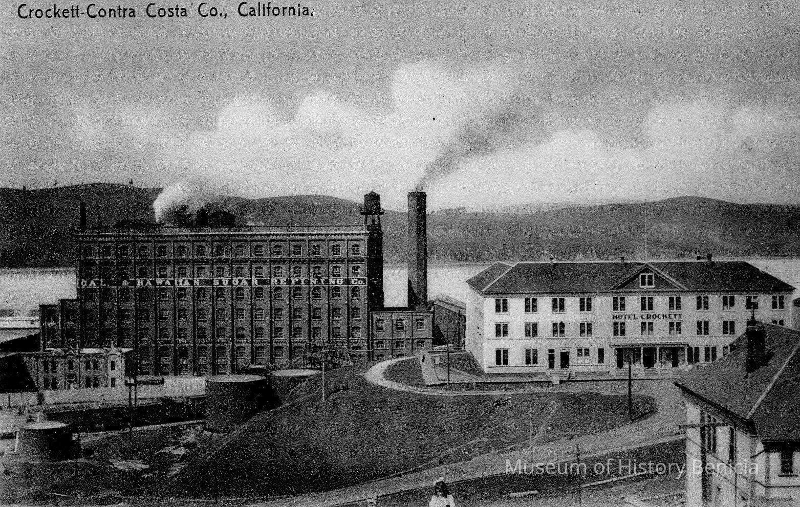 B/W postcard of the C & H Sugar Refinery (left) and Hotel Crockett (right) in turn-of-the-century Crockett, California.