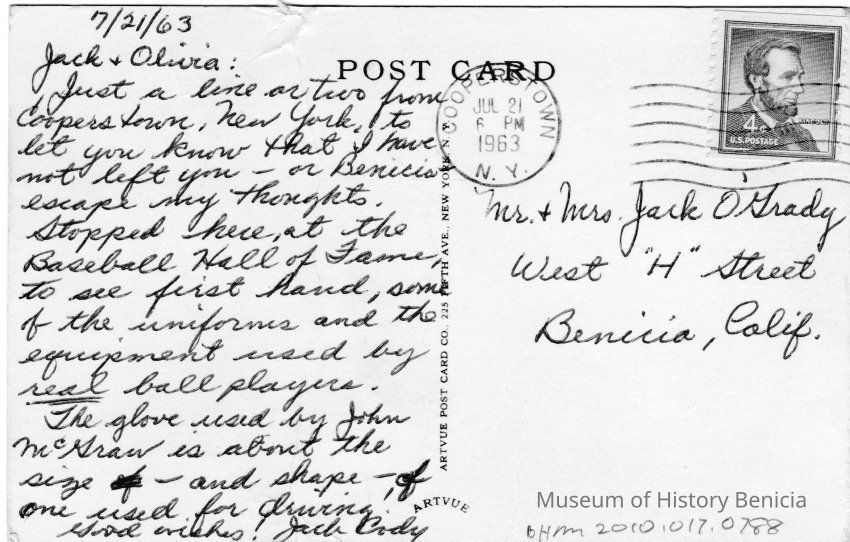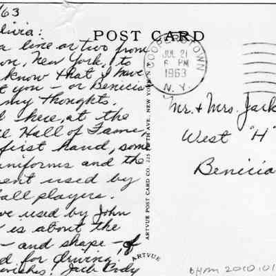 postcard to Jack O'Grady from Jack Cody.. Dated 07/21/1963. Talks about their trip to the Baseball Hall of Fame in Cooperstown.