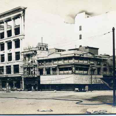 Postcard of downtown buildings in SF after the 1906 earthquake. There are wisps of smoke on the right side and a hose in the street. May have been taken while the city was still in flames. It is an undivided back real-photo postcard. Stamp design is a plain.Collection