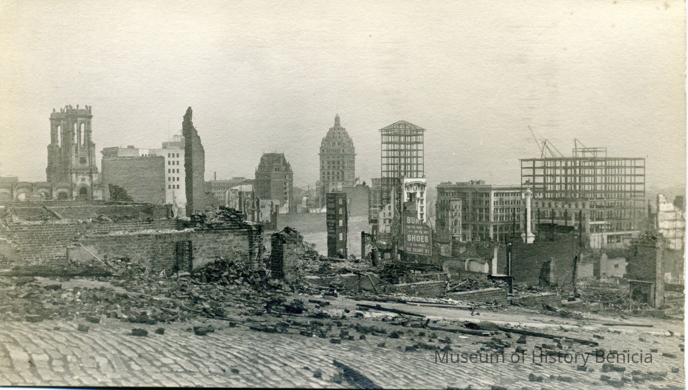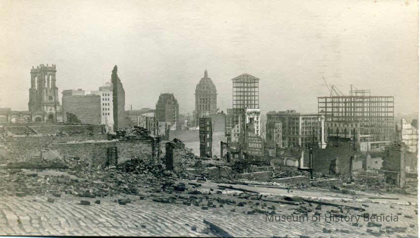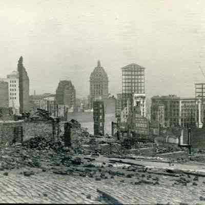 Postcard of downtown SF after the 1906 earthquake. The Call building can be seen in the distance. Looks very similar to a Molfino negative that is in the Museum collection. It is an undivided back real-photo postcard. Stamp design is a plain.Collection