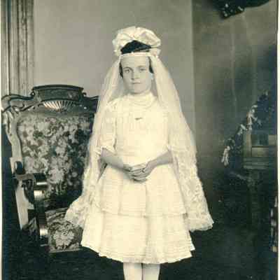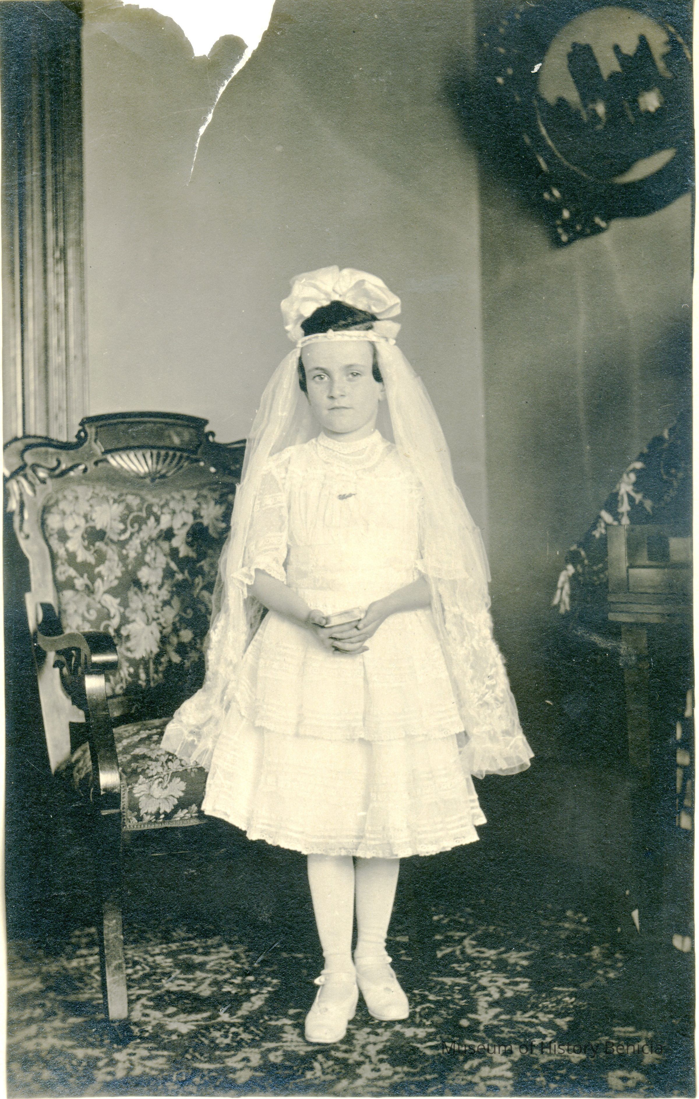 This is a real photo postcard of a girl ready to go to her first communion. The postcard is a divided back postcard (post 1907). It is printed on Velox paper . The stamp box says "place stamp here" and there are diamonds in the corners. It was probably printed between 1907 and 1917.Collection