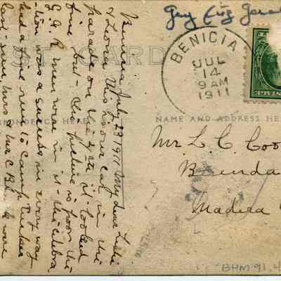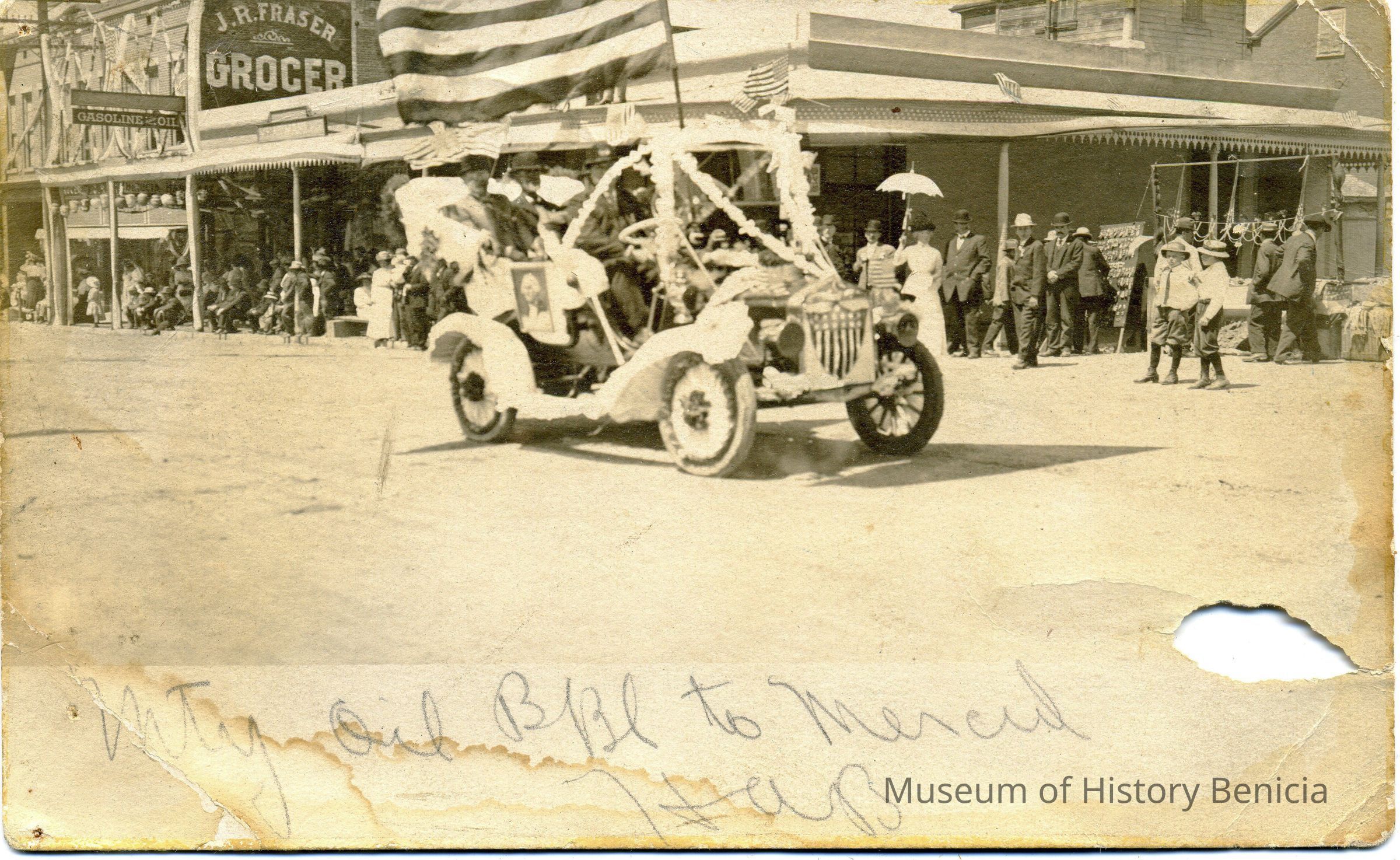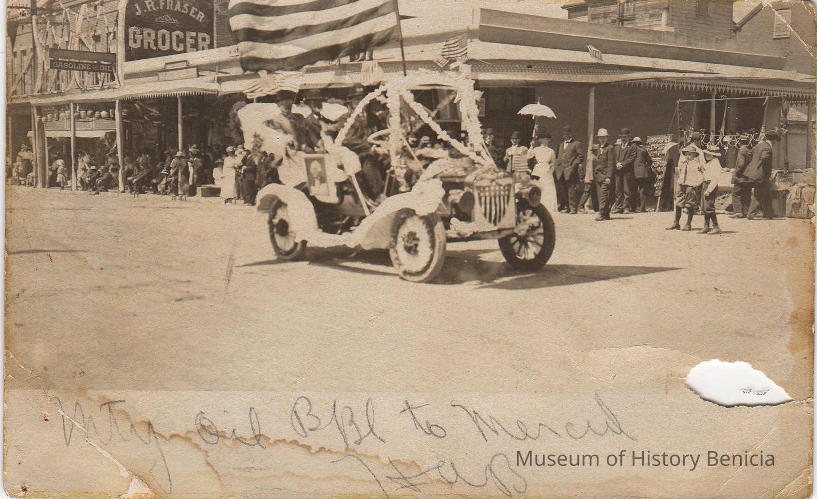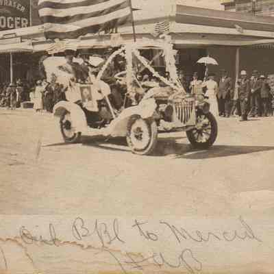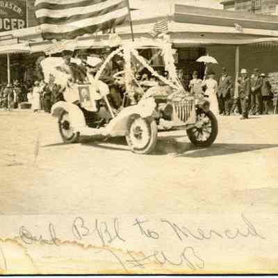 B/W photograph: Automobile in Fourth of July parade, 1911. Postcard sent to L.C. Cooper from his mother. This car was in the G.A.R. run to Camp Tucker. Photo taken on First Street between G and H Streets. (the car is in the intersection of first and H streets)Collection