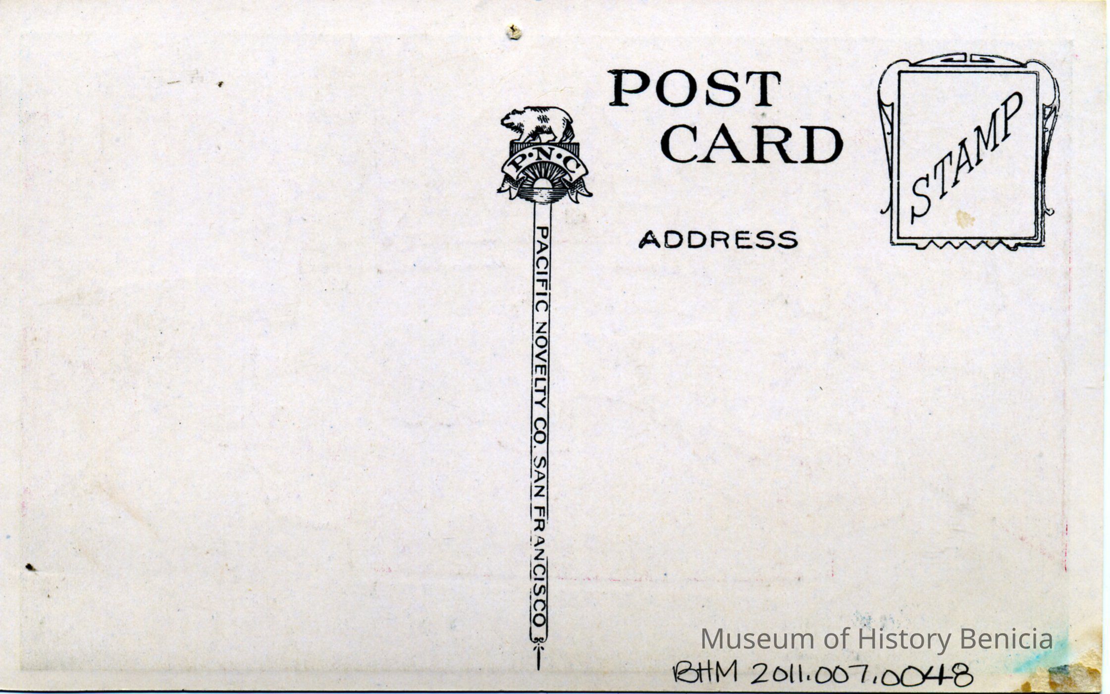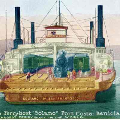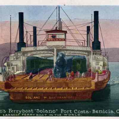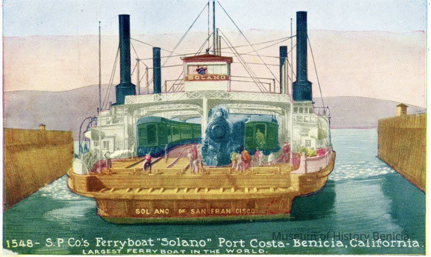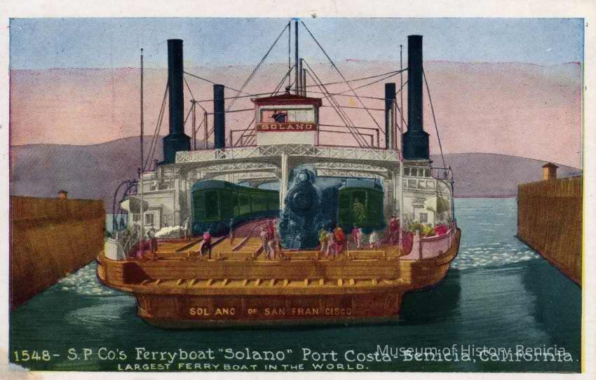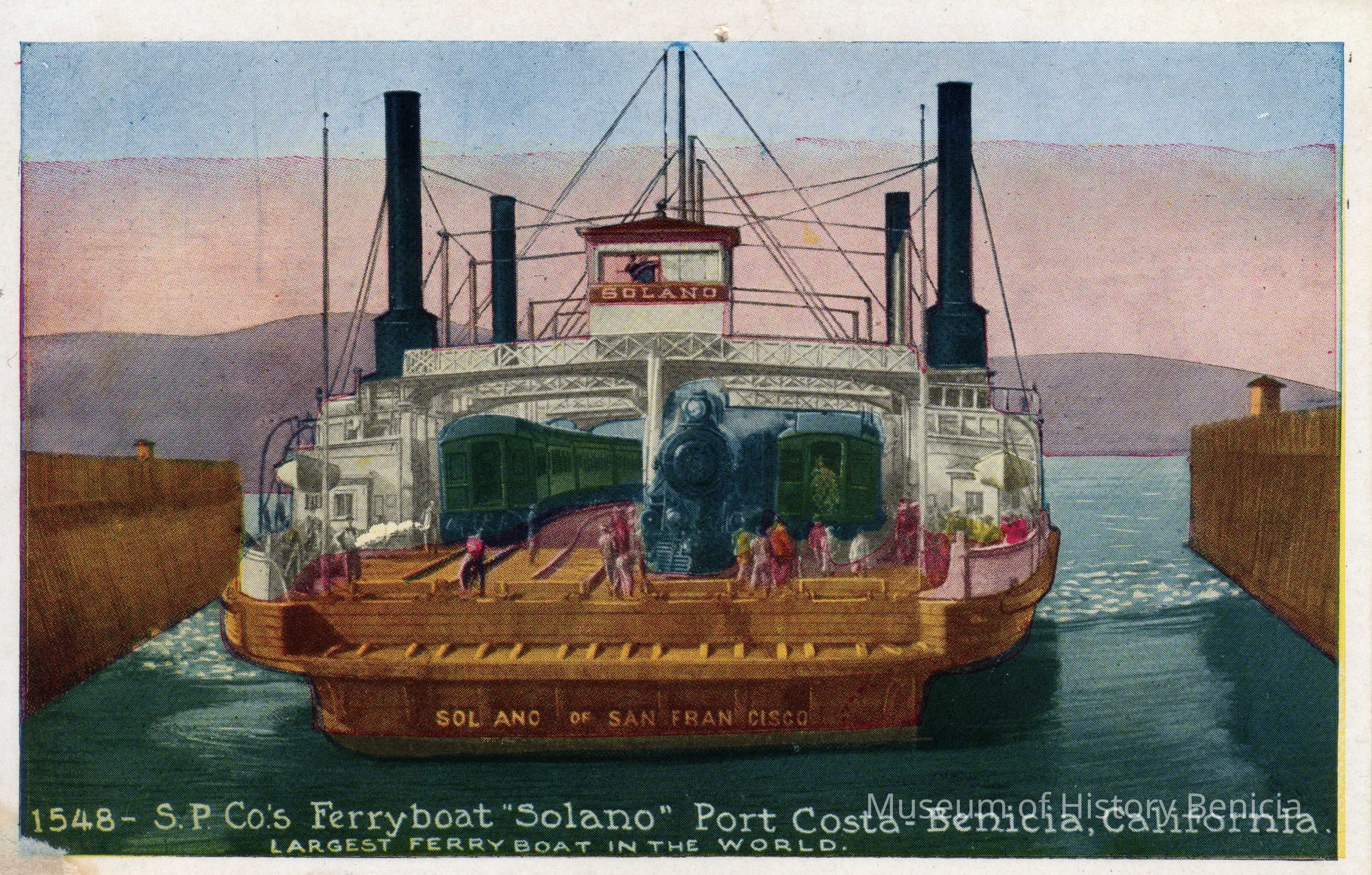 Photograph of the Solano ferry, built in 1879. Caption reads "S. P. Co's Ferryboat "Solano" Port Costa - Benicia, California" and beneath, "Largest Ferry Boat in the World". Nothing written on the back.Collection