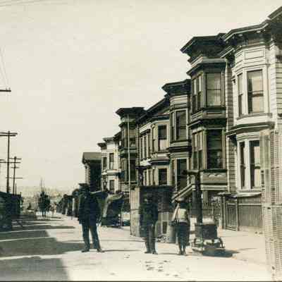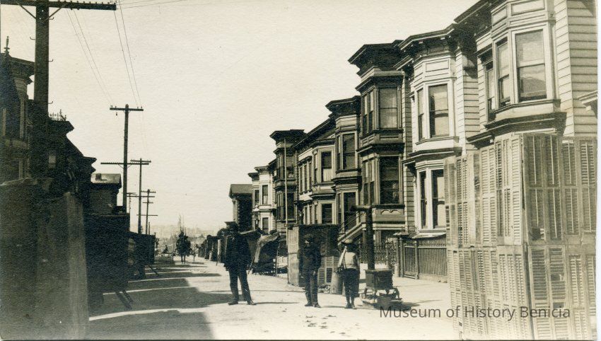 Postcard of a street in San Francisco after the 1906 earthquake. It shows kids playing in the street and stoves set out on the sidewalk for cooking because of the fear of fire. It has an undivided back. It is the same image that the museum has on a negative attributed to John Molfino.Collection