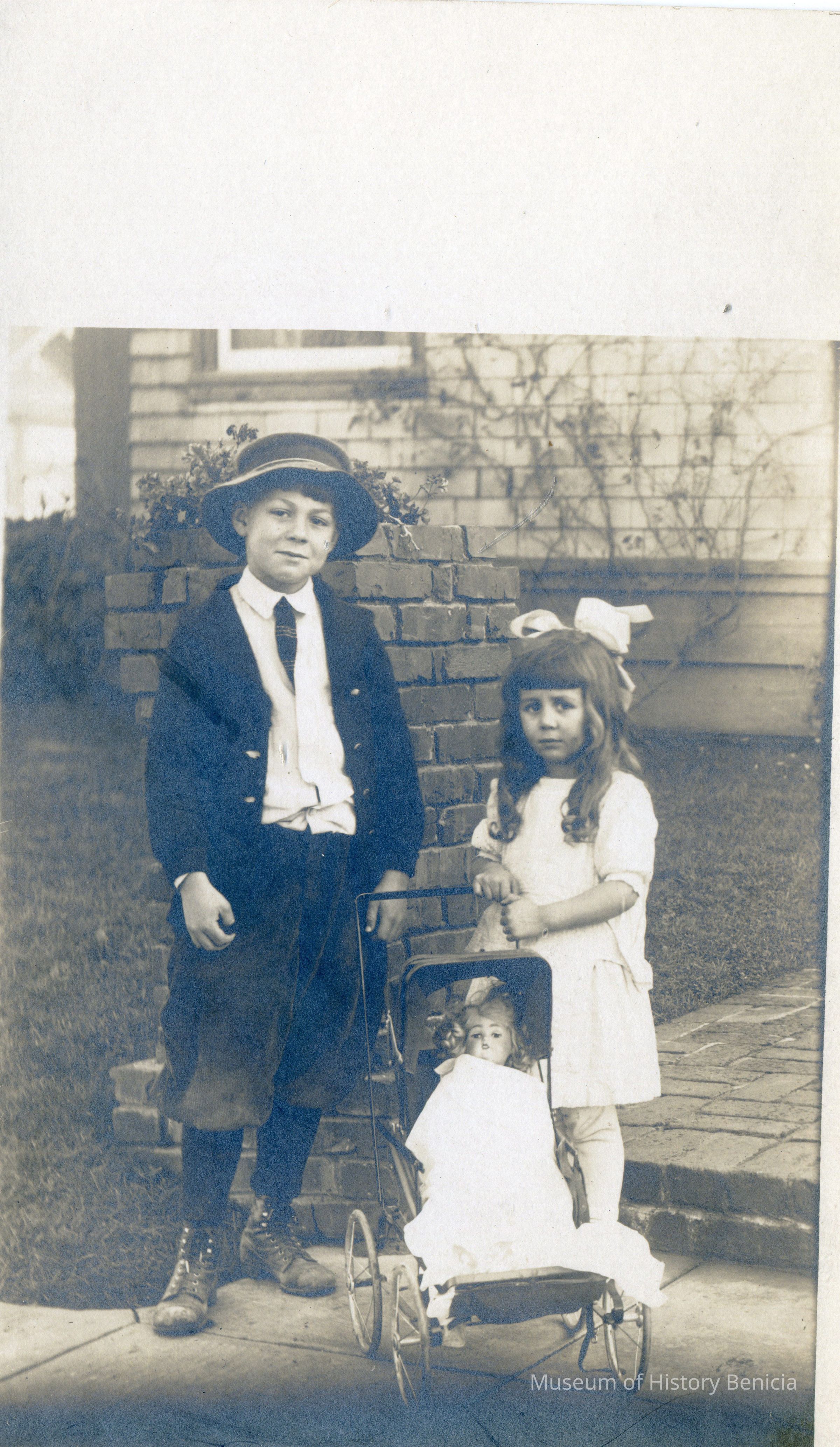 A photo of aboy and a girl with a doll carriage. There is a doll in the carriage.