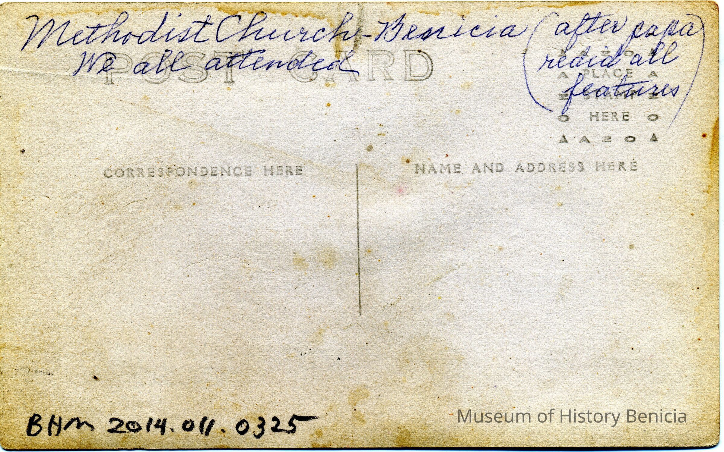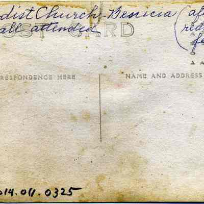 This is a real photo postcard of the Methodist Church. The back says it was "redone" by "papa". Not sure who it refers to. The postcard is a divided back postcard (post 1907). It is printed on AZO paper with the four arrows in the corners of the stamp box pointing up (1904-1918). This card was probably printed between 1907 and 1918.Collection