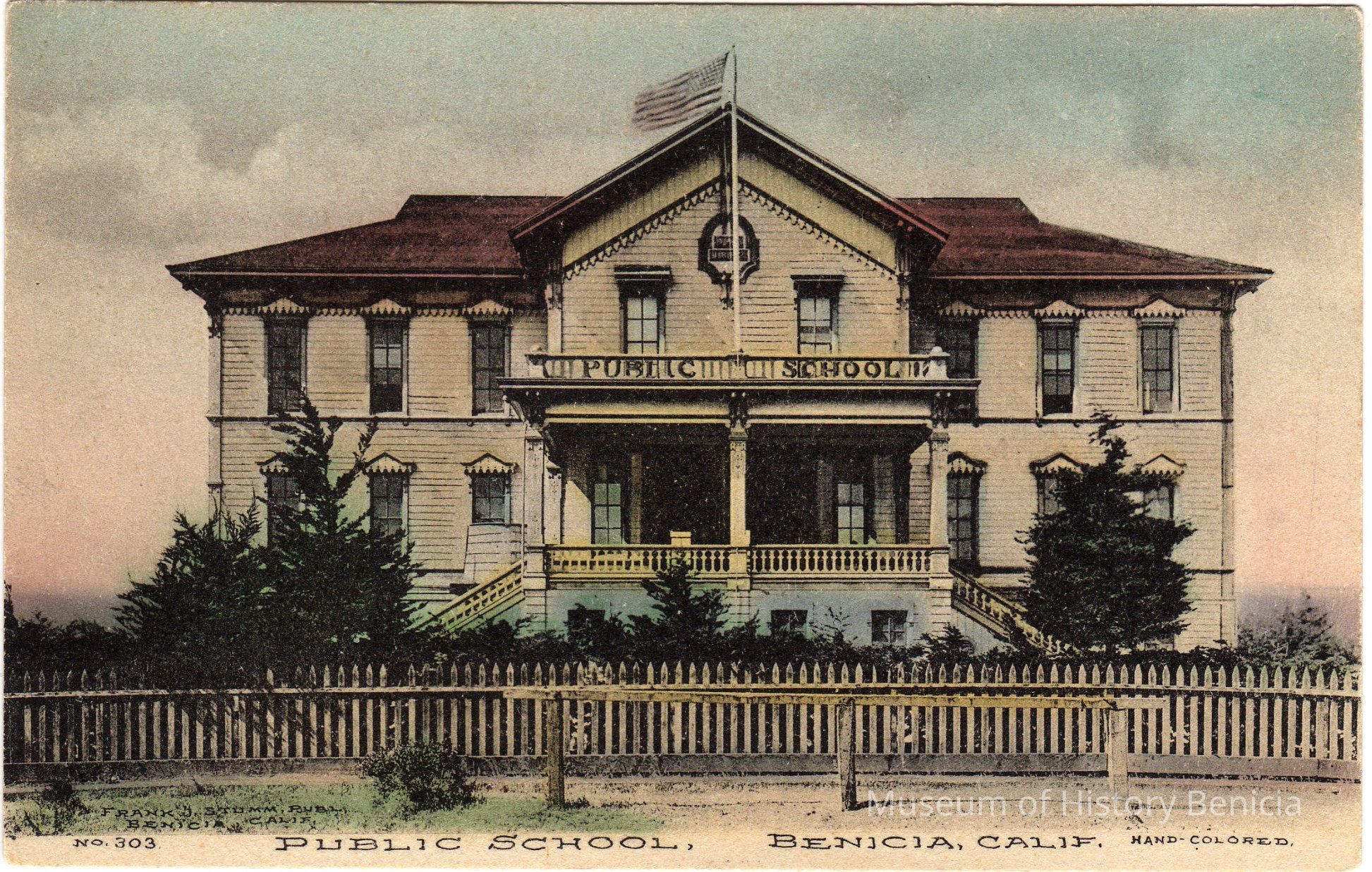 Hand colored postcard (unsent) of Public School, Benicia Calif. by Frank Stumm No. 303