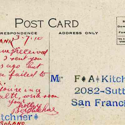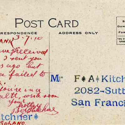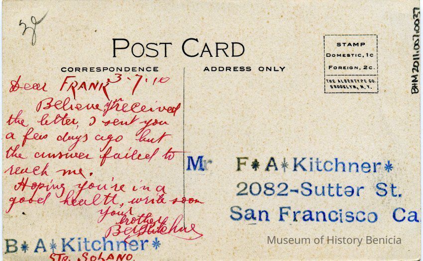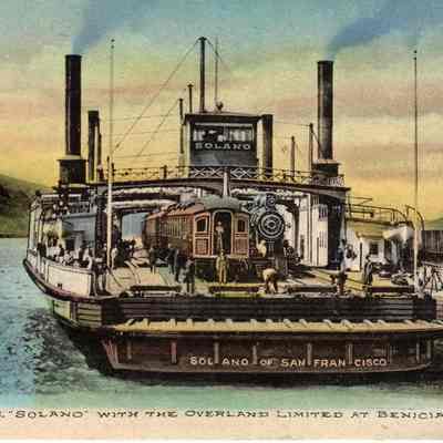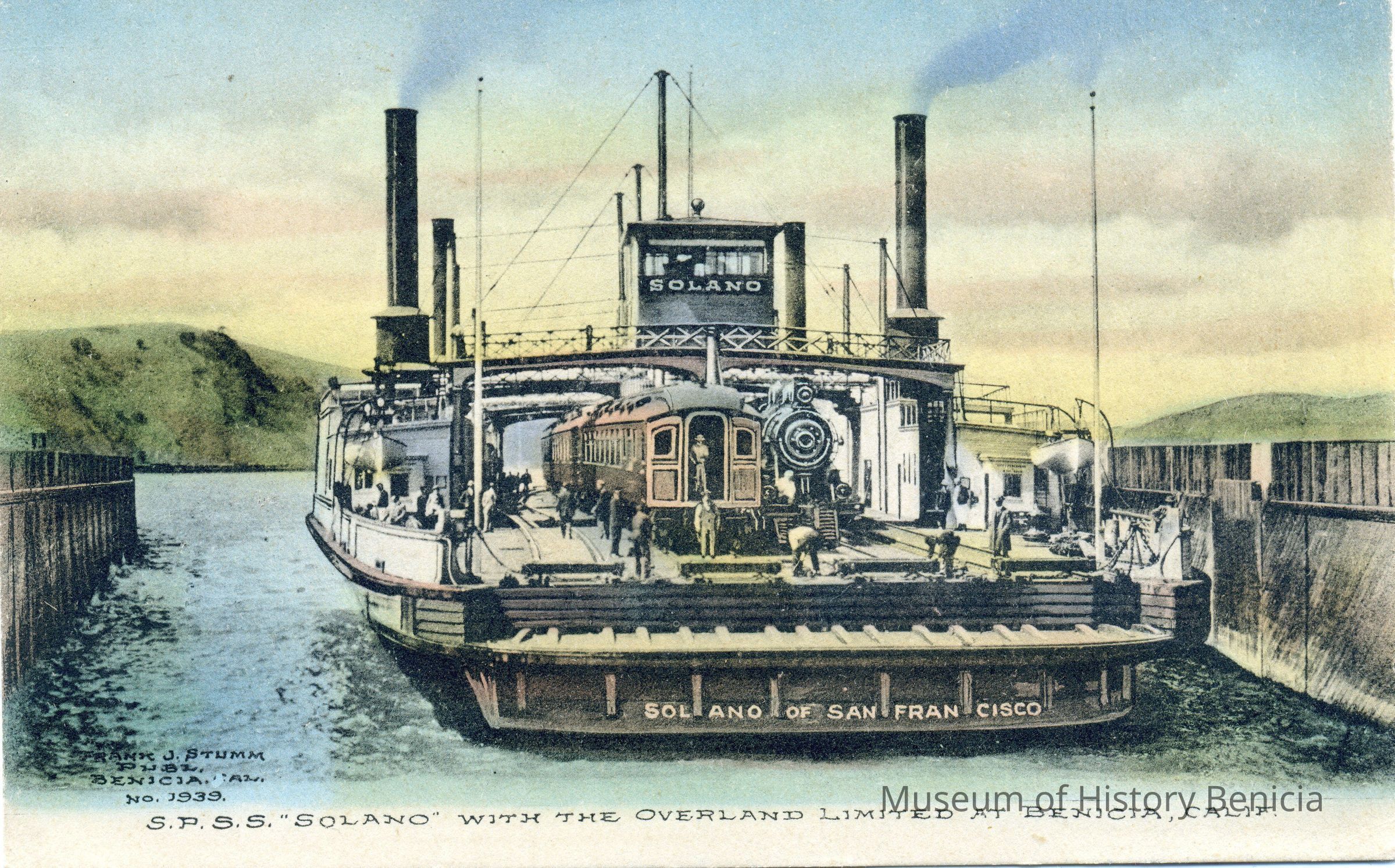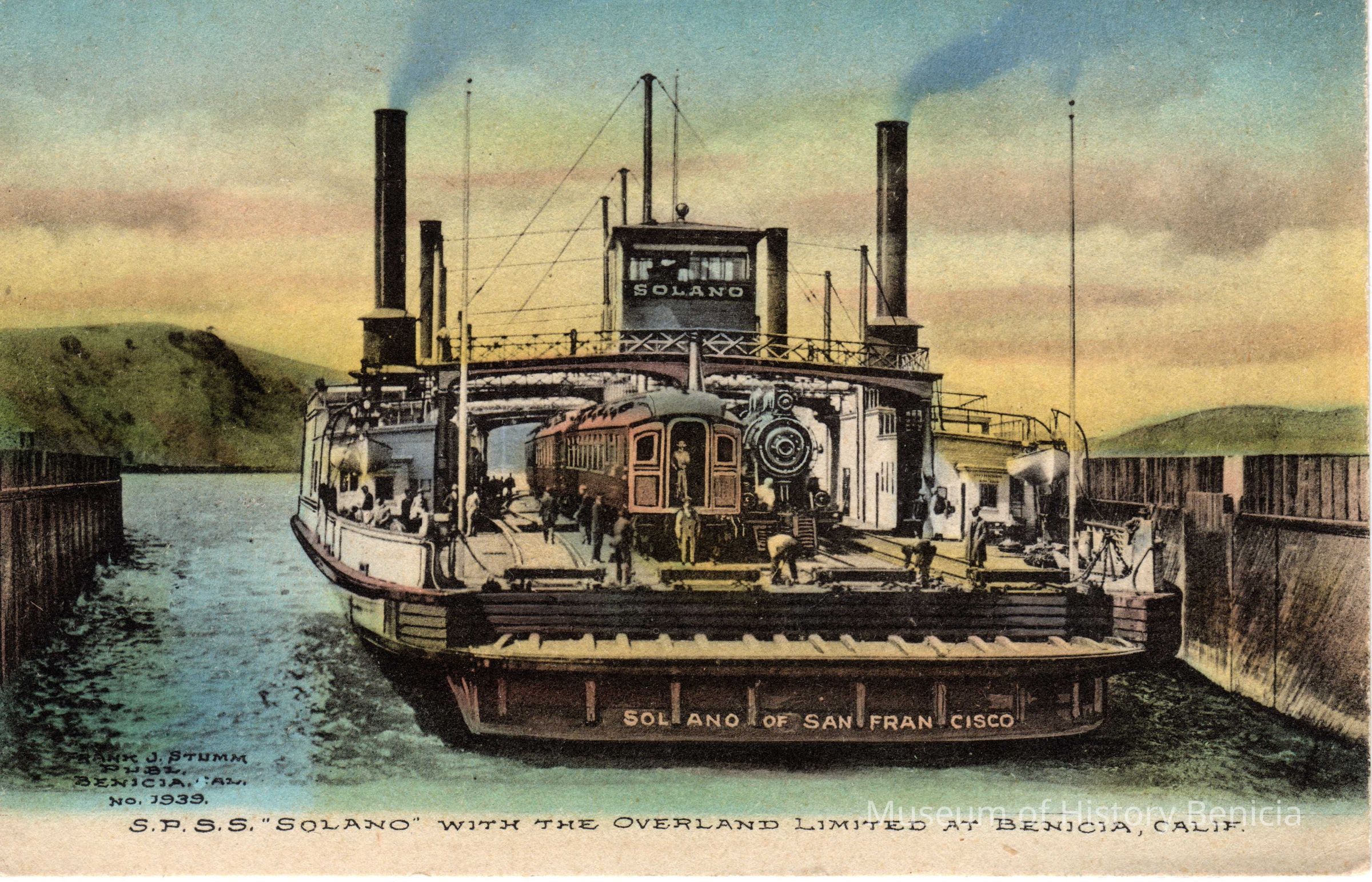 Postcard of a watercolor of the Solano ferry, with caption "S.P.S.S. "Solano" with the Overland Limited at Benicia, Calif." Writing on the postcard is dated 3.7.10. (1910) Reads, "Dear Frank, Believe you received the letter I sent you a few days ago but the answer failed to reach me. Hoping you're in a good health, write soon, your brother B--- Kitchner". Sent to a Frank Kitchner on Sutter St. in San Francisco.Collection