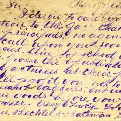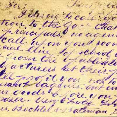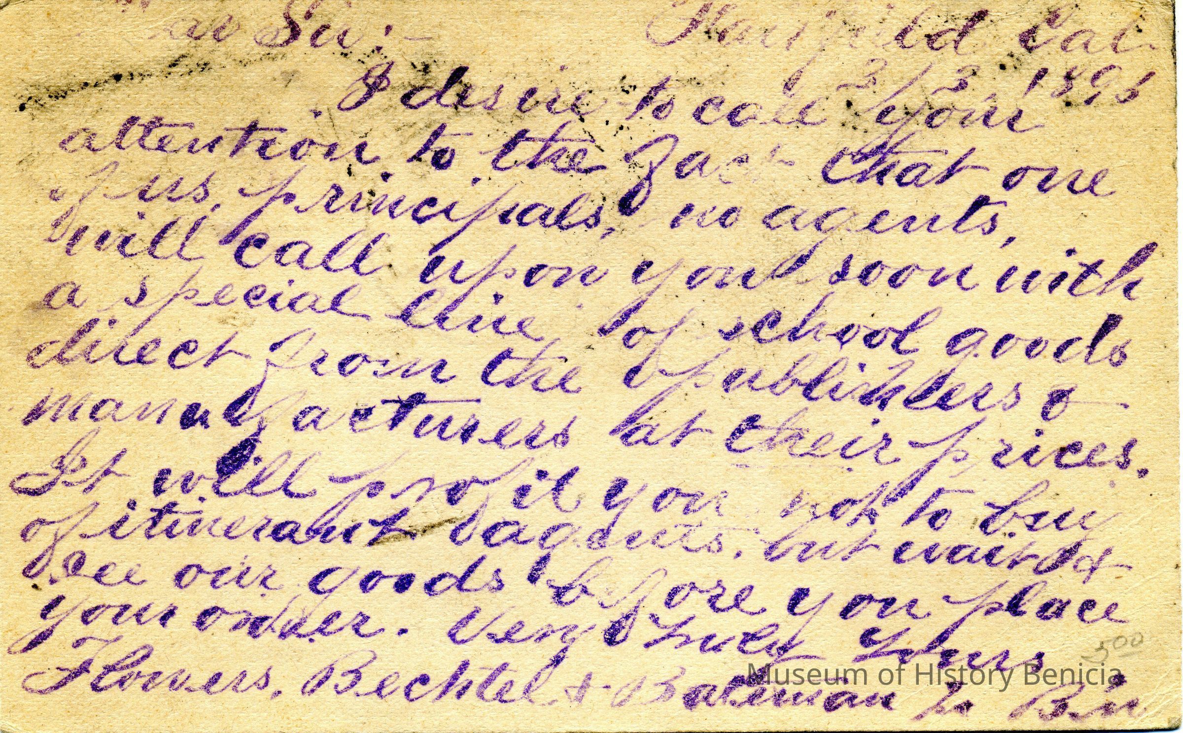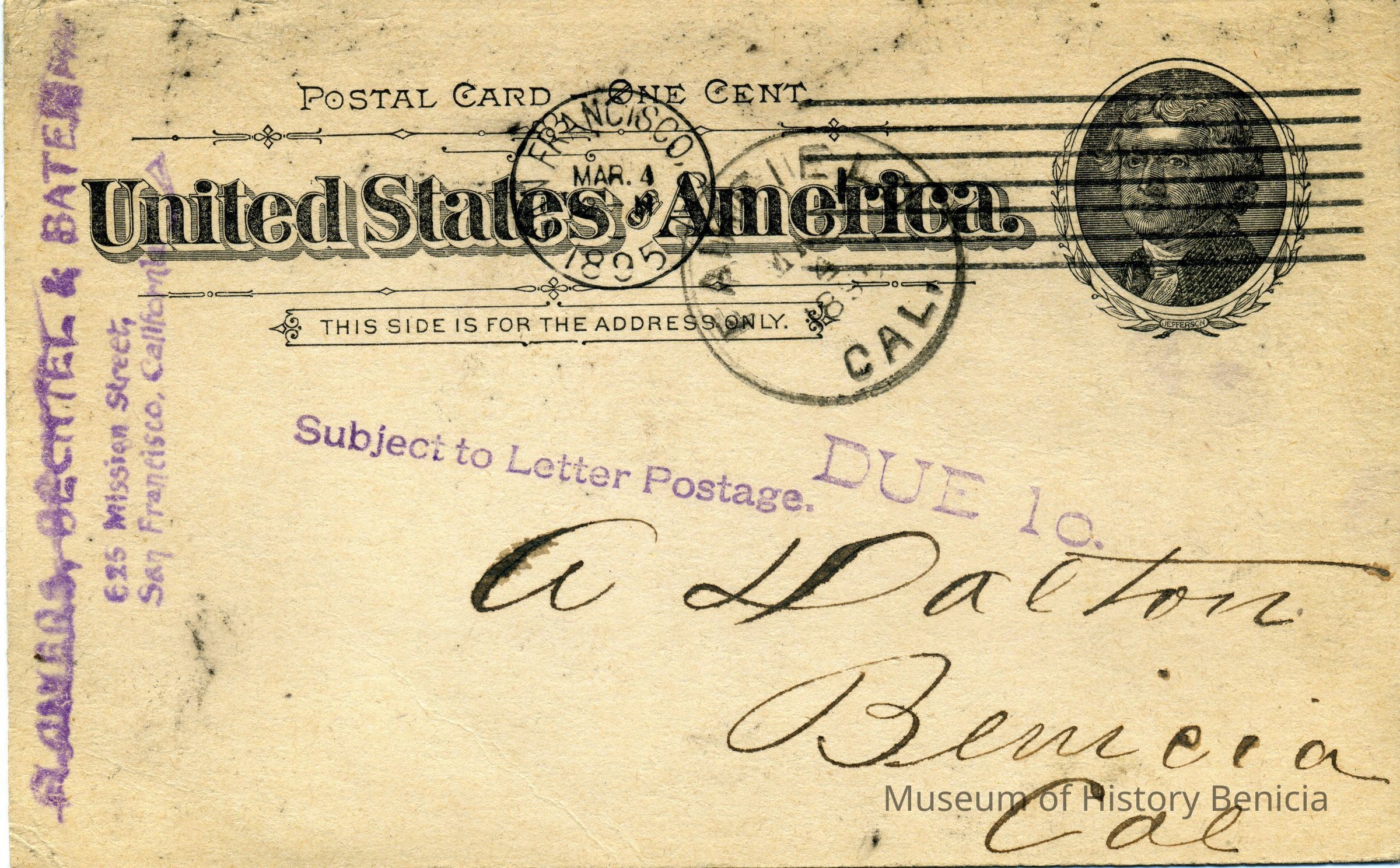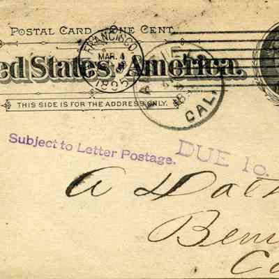 Postcard from 03/04/1895 sent to A. Dalton Benicia Cal. This is a card from a texbook publisher sent to Alfred Dalton because of his position on the school board. It looks like a stamped message telling Alfred to expect a visit from a salesman of school goods.