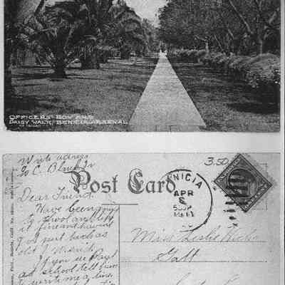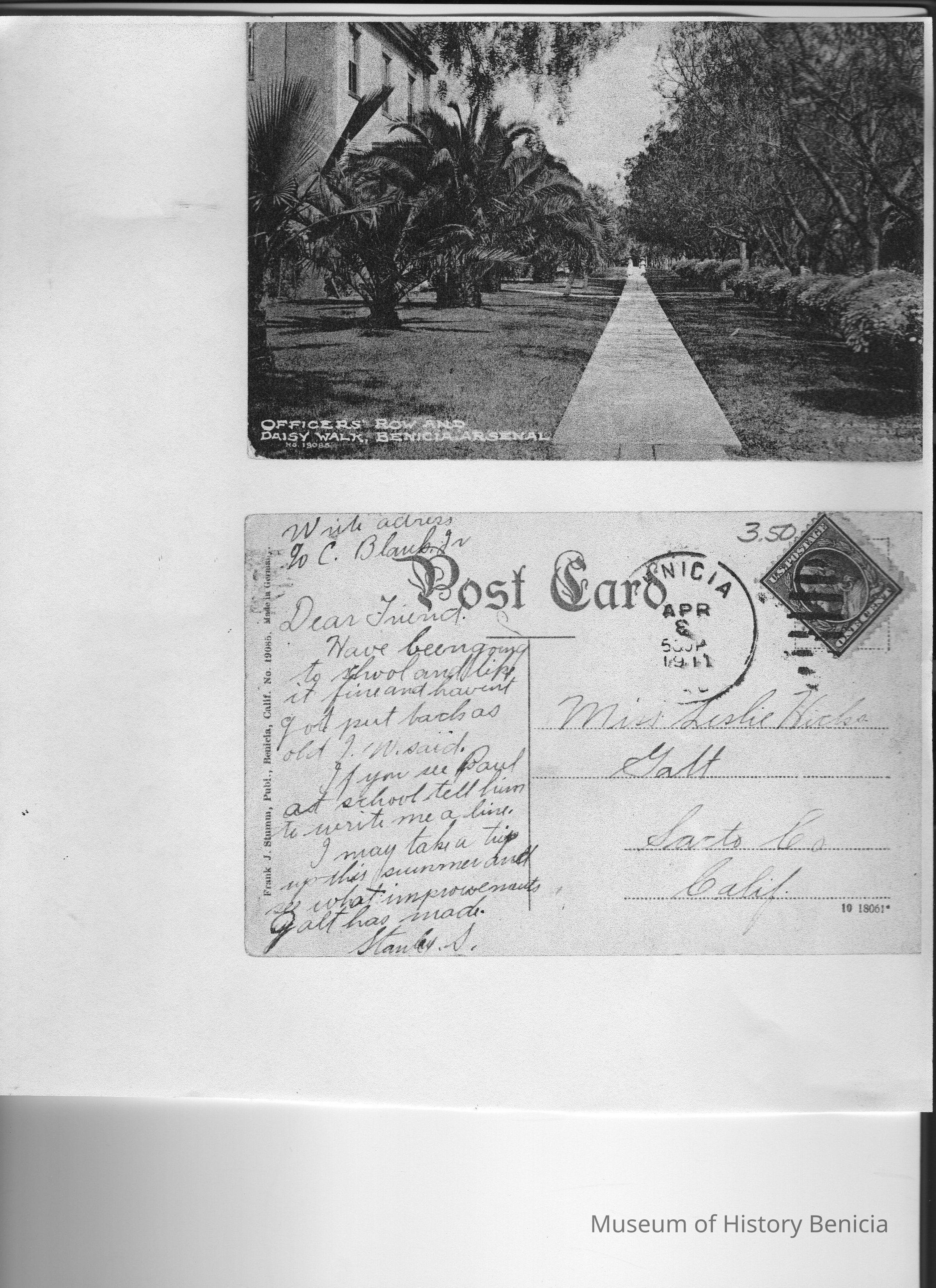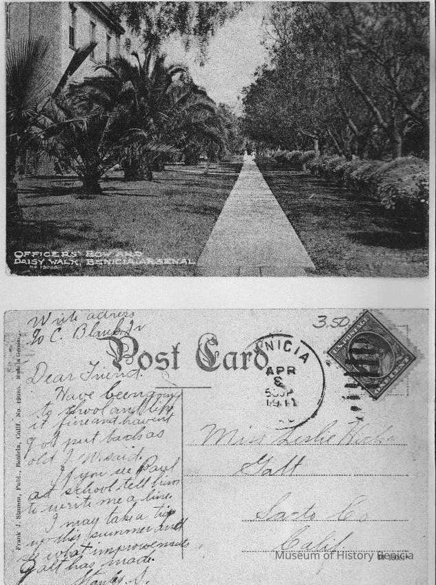 photocopy of the front and back of postcard of "Officers'Row and Daisy Walk, Benicia Arsenal."