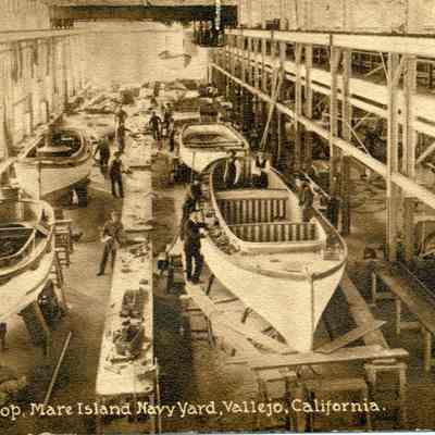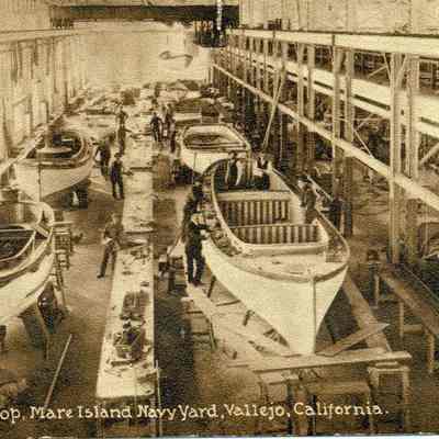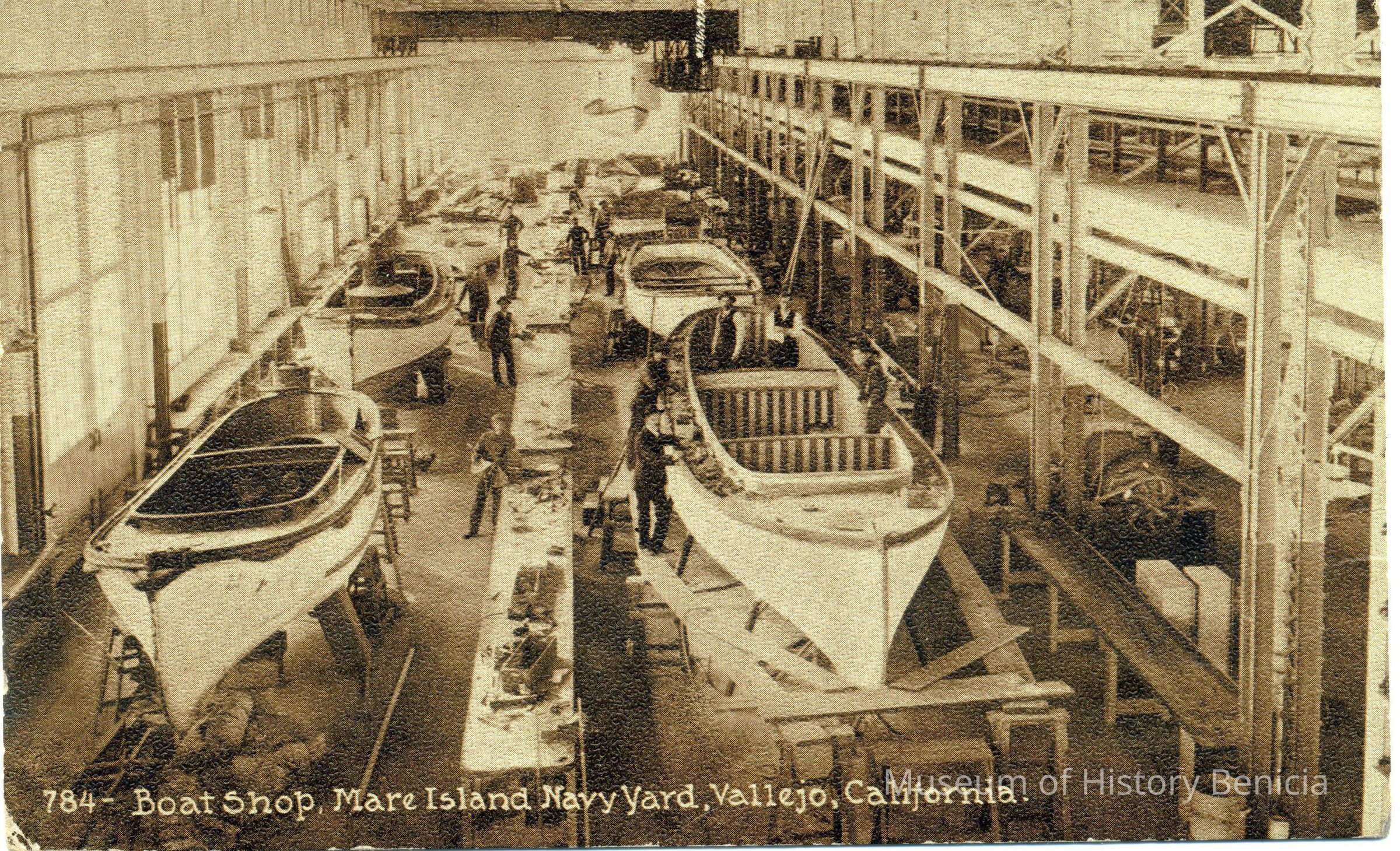 Postcard of Boat Shop Mare Island Navy Yard, Vallejo, California. This is numbered 784 and was published by Edward H Mitchell. The image is exactly the same as a Frank Stumm postcard. The Frank Stumm postcard is an undivided back card and this one is a divided back card therefore the Stumm card pre-dates this card.Collection