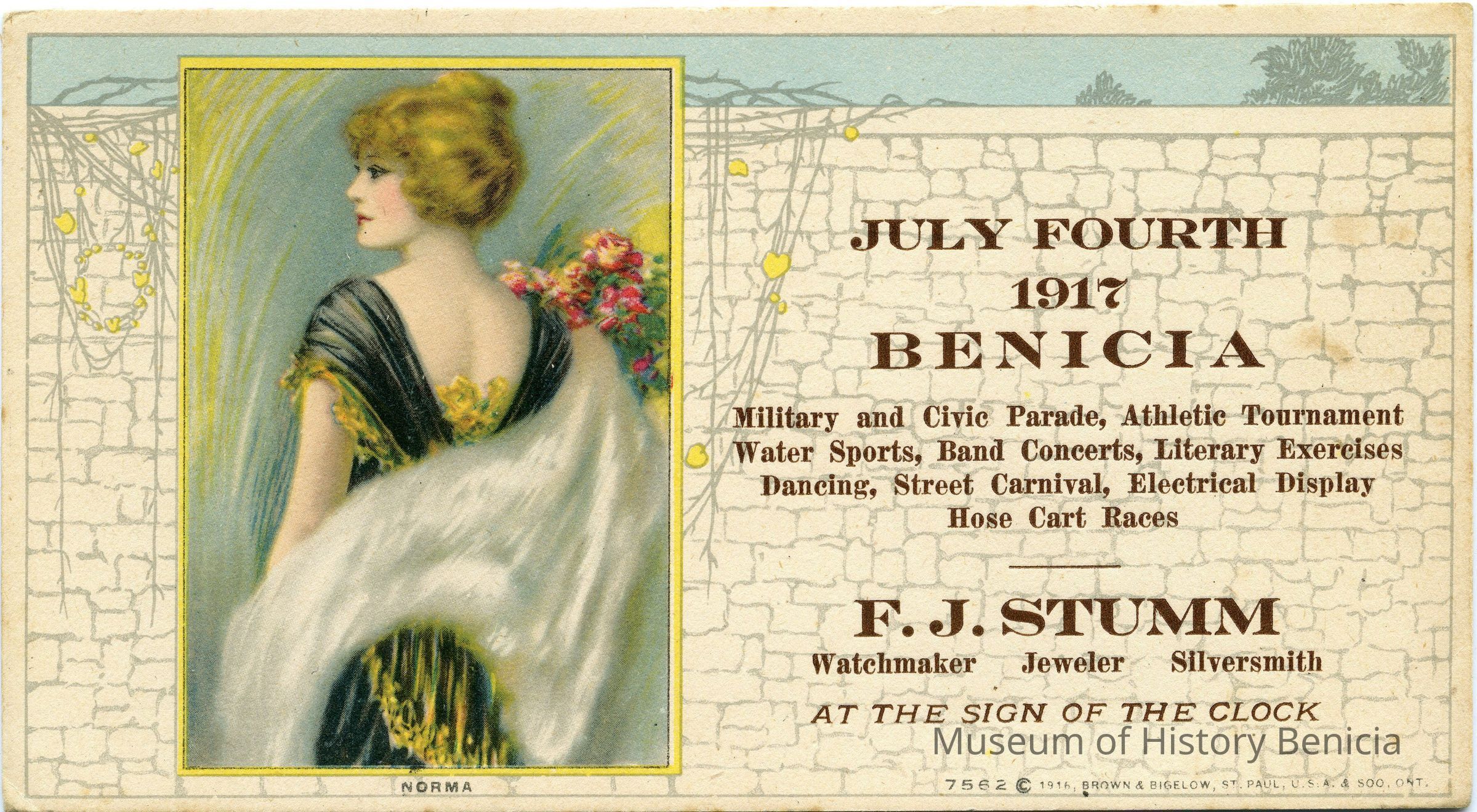 This is an advertizing postcard for the F.J. Stumm store in Benicia, CA. The inscription notes "July Fourth 1917 and has a list of activities: