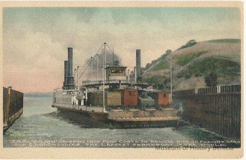 Color postcard with a picture of the "Solano" ferry crossing the bay from Port Costa to Benicia. Caption below the image says "S.P.S.S. 'Solano' crossing from Port Costa to Benicia with 38 freight cars and 2 locomotives, the largest ferryboat in the world." The Lenoir Miller Collection.Collection