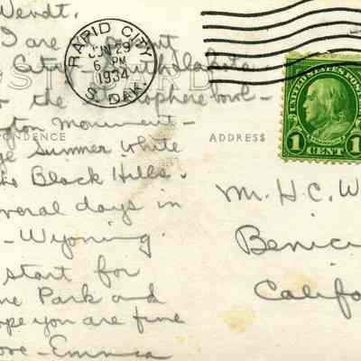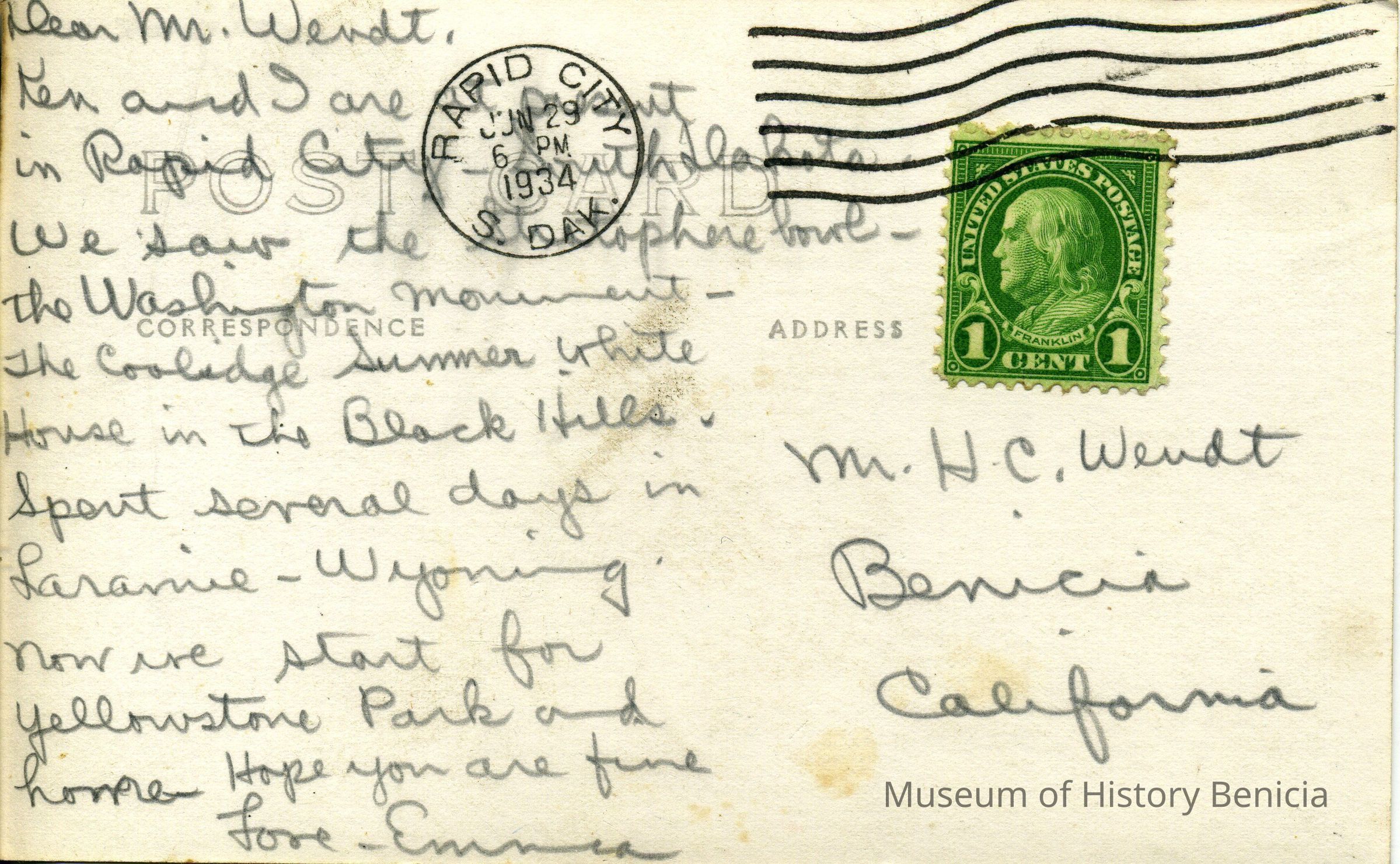 Postcard is from a woman named Emma in Rapid City, South Dakota to Mr. H.C. Wendt in Benicia, California. She explains that they (mentioned Ken) saw the Washington monument, Coolidge Summer White House in the Black Hills, and went to Wyoming. Now they are heading to Yellowstone park and then home.Collection