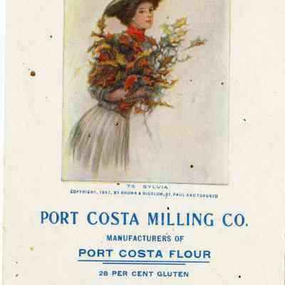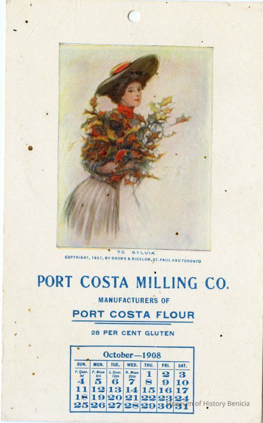 This is a postcard for Port Costa Milling Co. It contains a calendar page for October, 1908. It also says they are manufactures of Port Costa Flour which is 28 percent Gluten. The back is stamped with the name and address:
