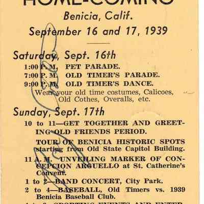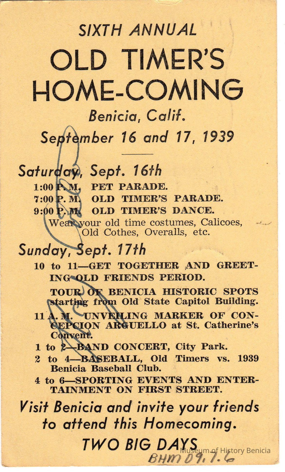 Information/Announcement card for "Sixth Annual Old Timer's Home-Coming Benicia Calif.