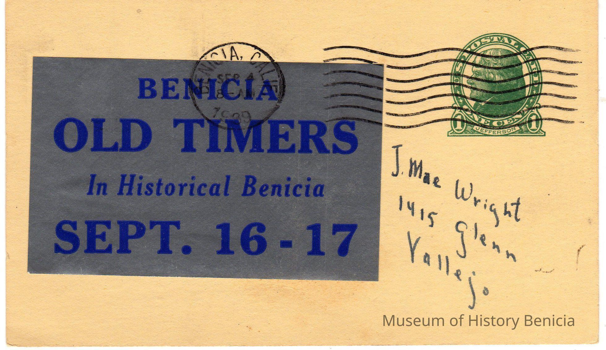 on address side: sliver sticker, blue ink: "Benicia Old Timers in Historical Benicia Sept 16-17"