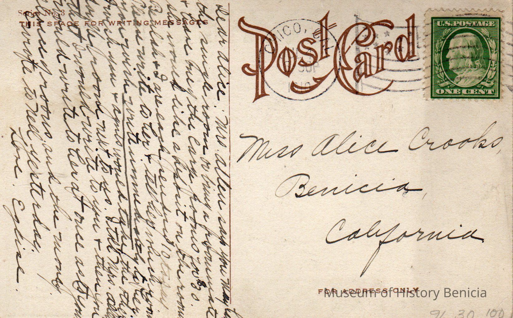 green, gray, and gold image of "Billiken" addressed to Miss Alice Crooks from Eglise.