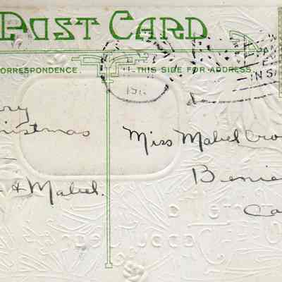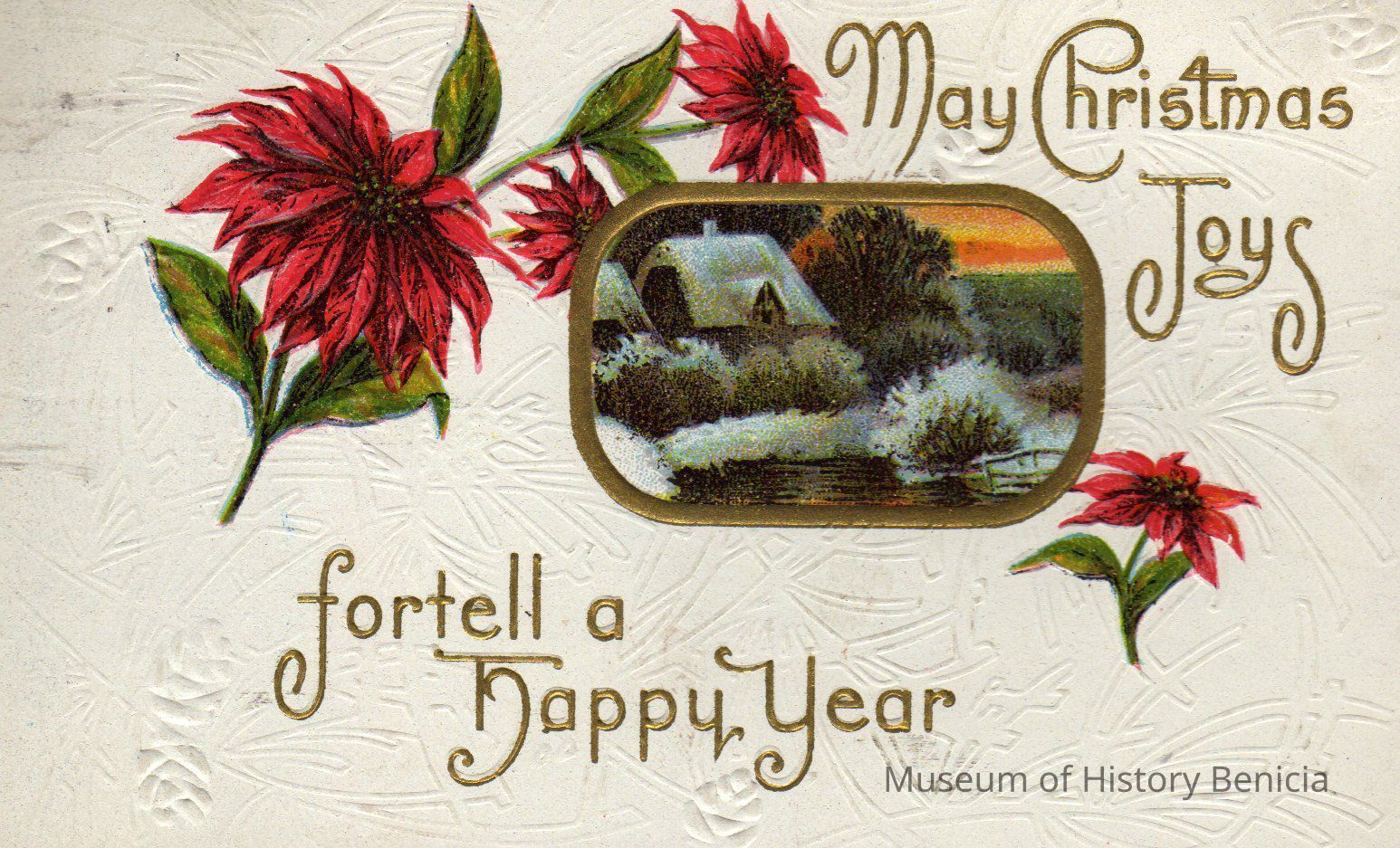 Poinsettias and cottage with "May Christmas Joys Foretell a Happy Year" Addressed to Mabel Crooks from Anna and Mabel.