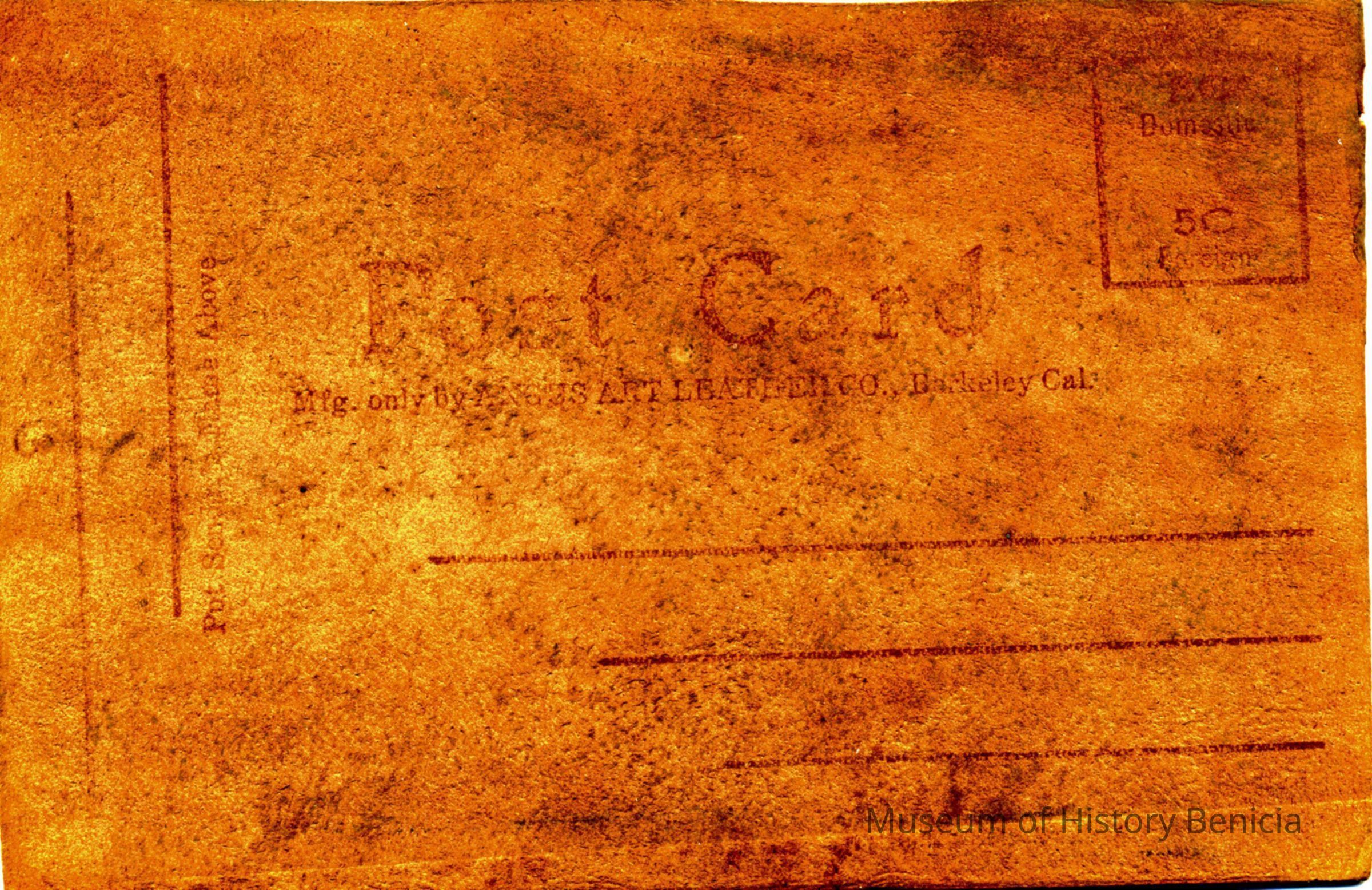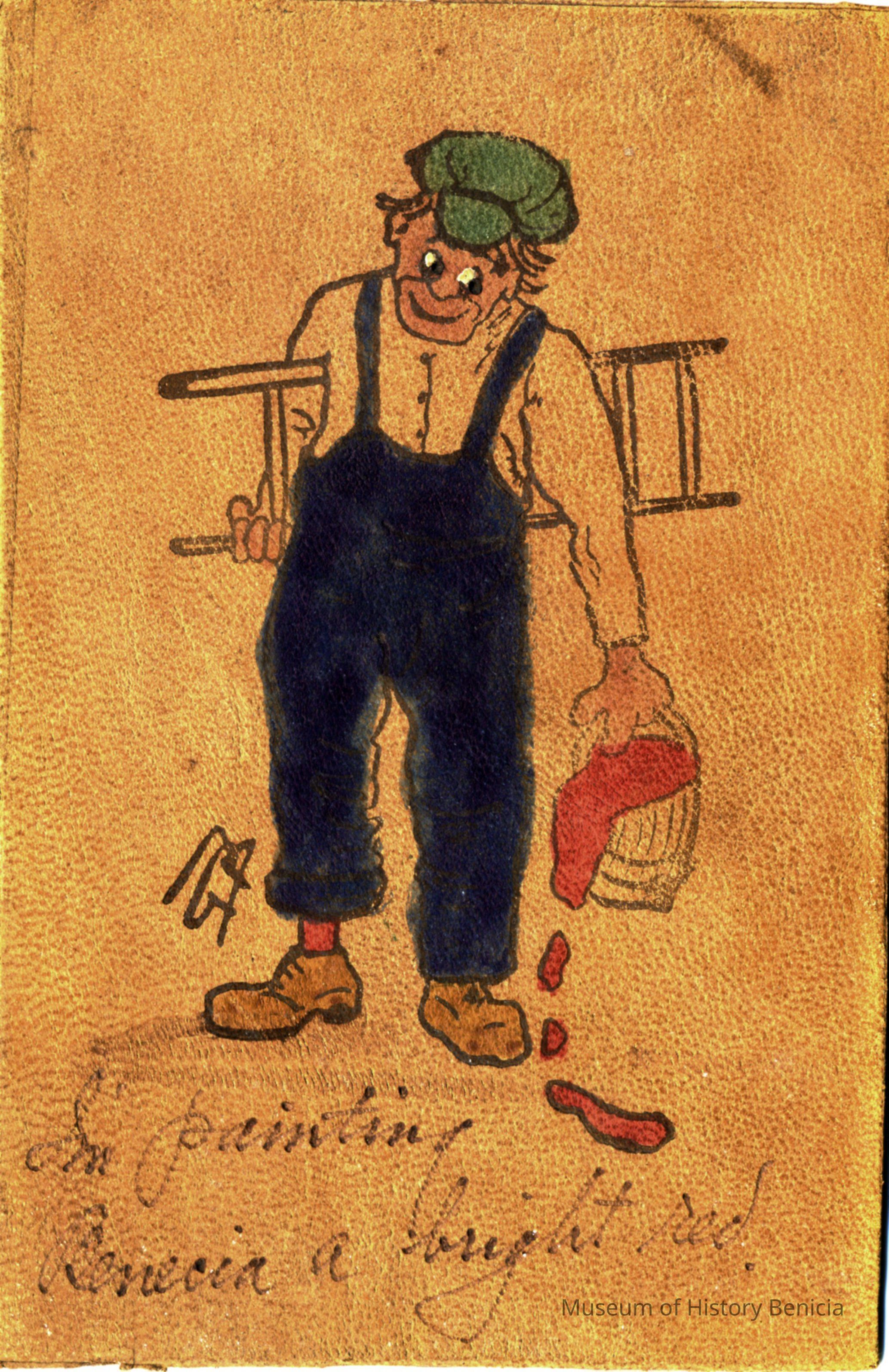 This is a funny postcard printed on leather. It shows a boy with a buckett of paint and a ladder. The caption says "I'm painting Benecia (sic) a bright red."The back is blank.Collection