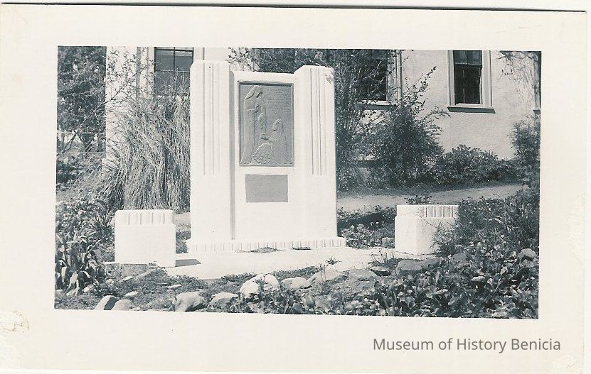 B/w photograph on a postcard. Depicts a marker in the garden of St. Catherine's convent, dedicated to the memory of Conception Arguello. A label on the reverse side has the text: "This beautiful marker was erected in the garden at Saint Catherine's Convent, and dedicated to the memory of Concepcion Arguello (Sister Mary Dominica) at the 1939 Benicia Old Timer's Celebration." The Lenoir Miller Collection.Collection