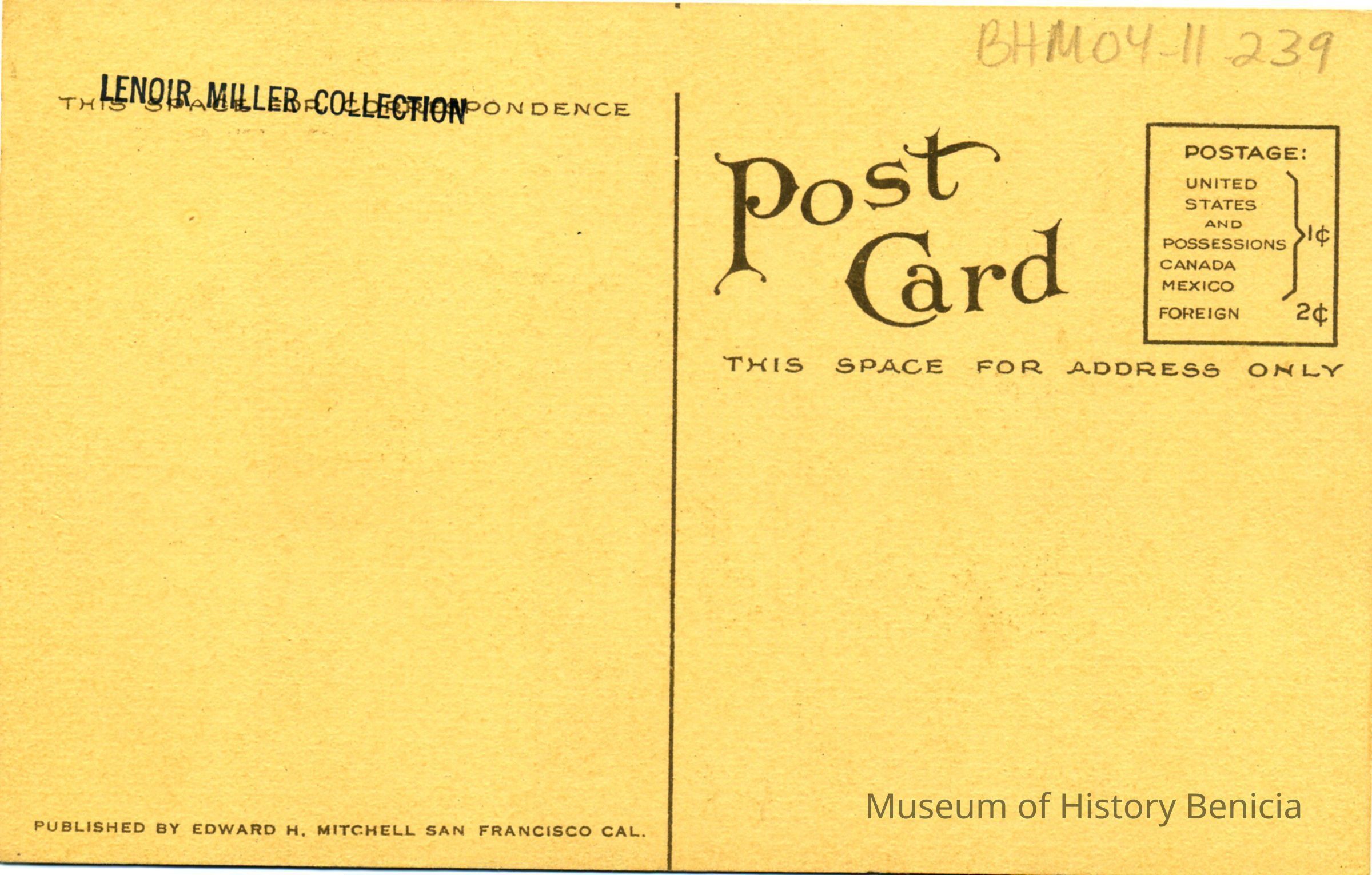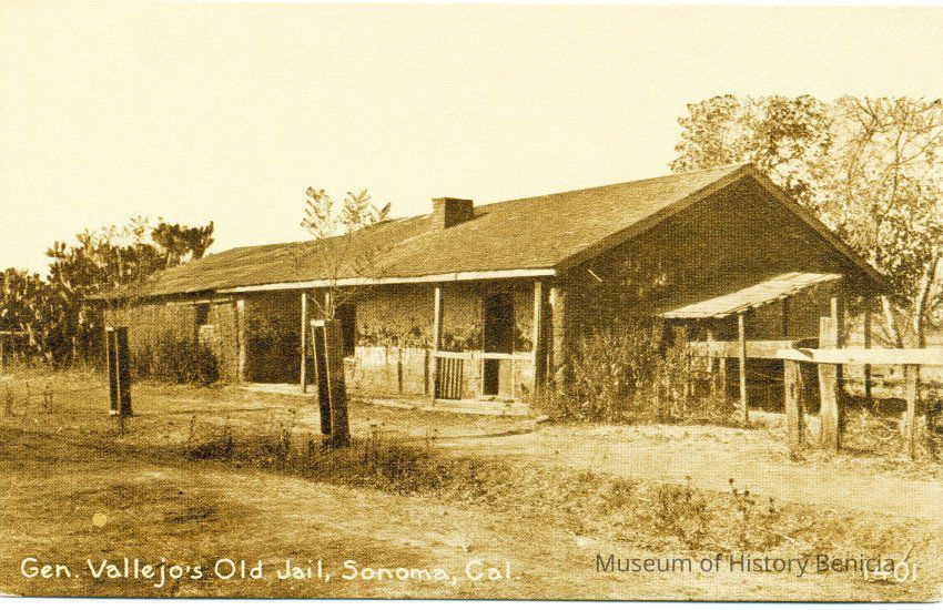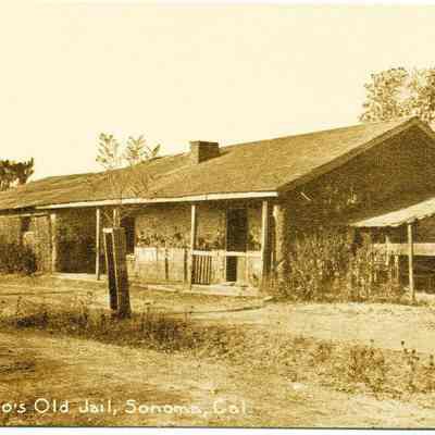 Sepia toned postcard with the image of General Vallejo's old jail in Sonoma California. The Lenoir Miller Collection.