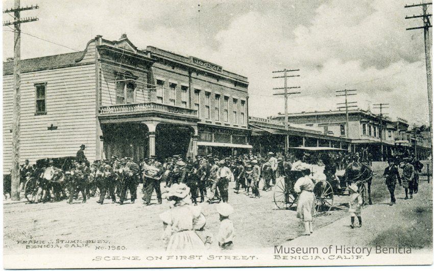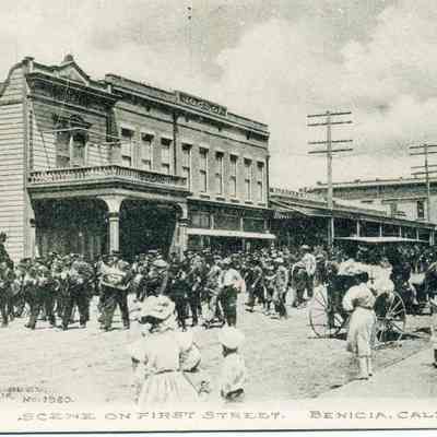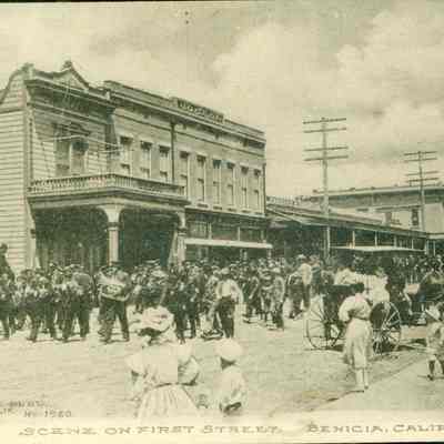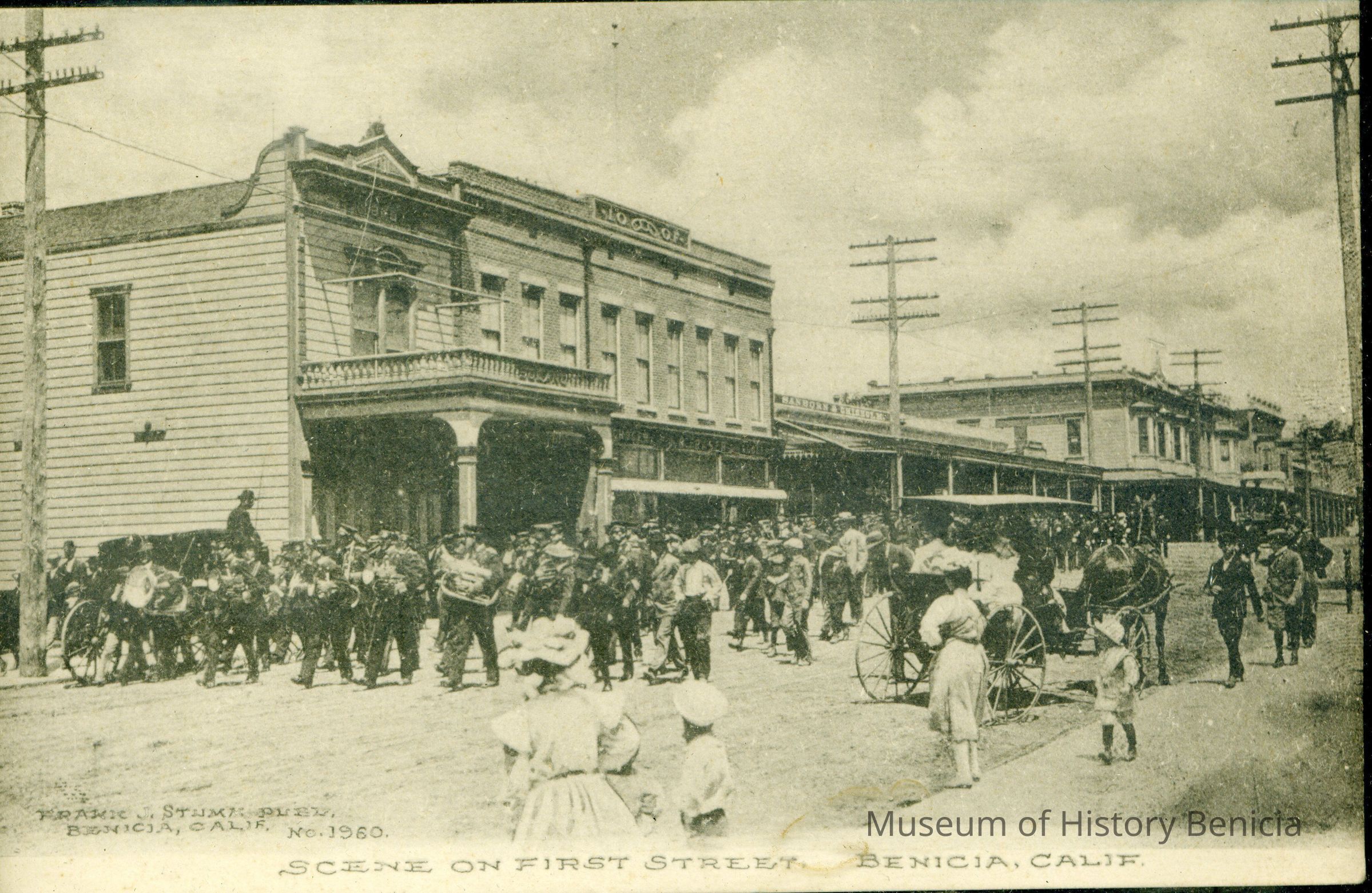 B/W photograph (possibly a postcard) framed in black under glass. It is a parade on first street Benicia showing a marching band with women and children watching and horse carts by the curb and each side of the street. The caption at the bottom of the card reads: "Scene on First Street. Benicia, Calif." Also in the lower left on the photograph is printed: " Frank J. Stumm publ. Benicia, Calif. No. 1960".Collection