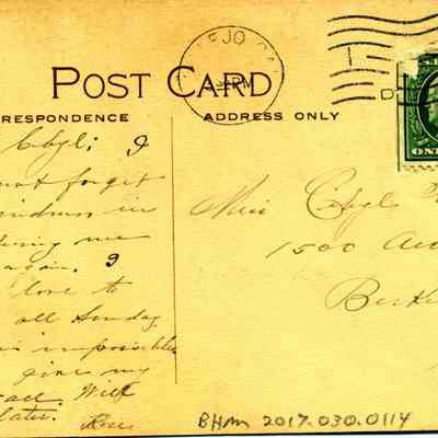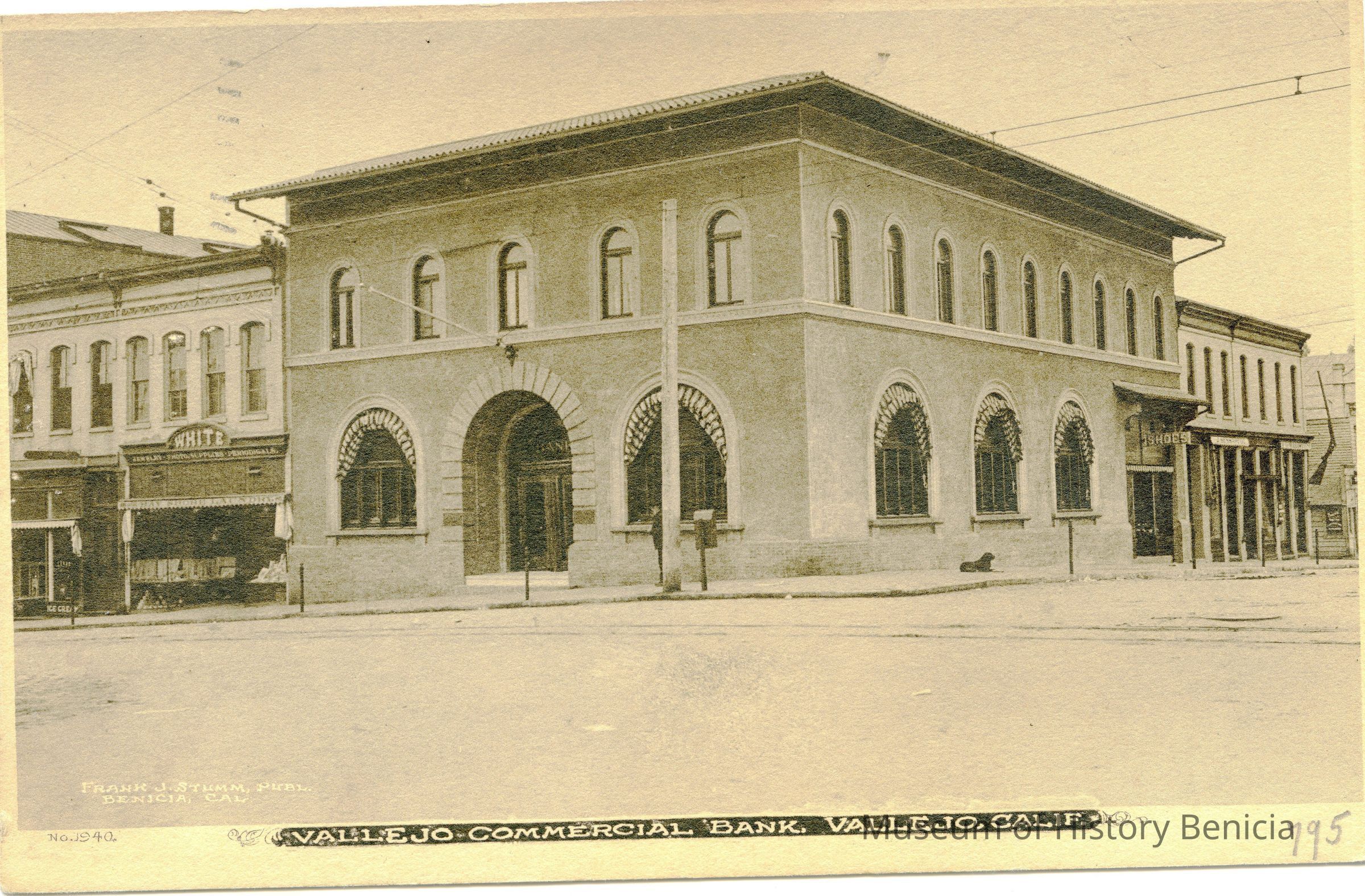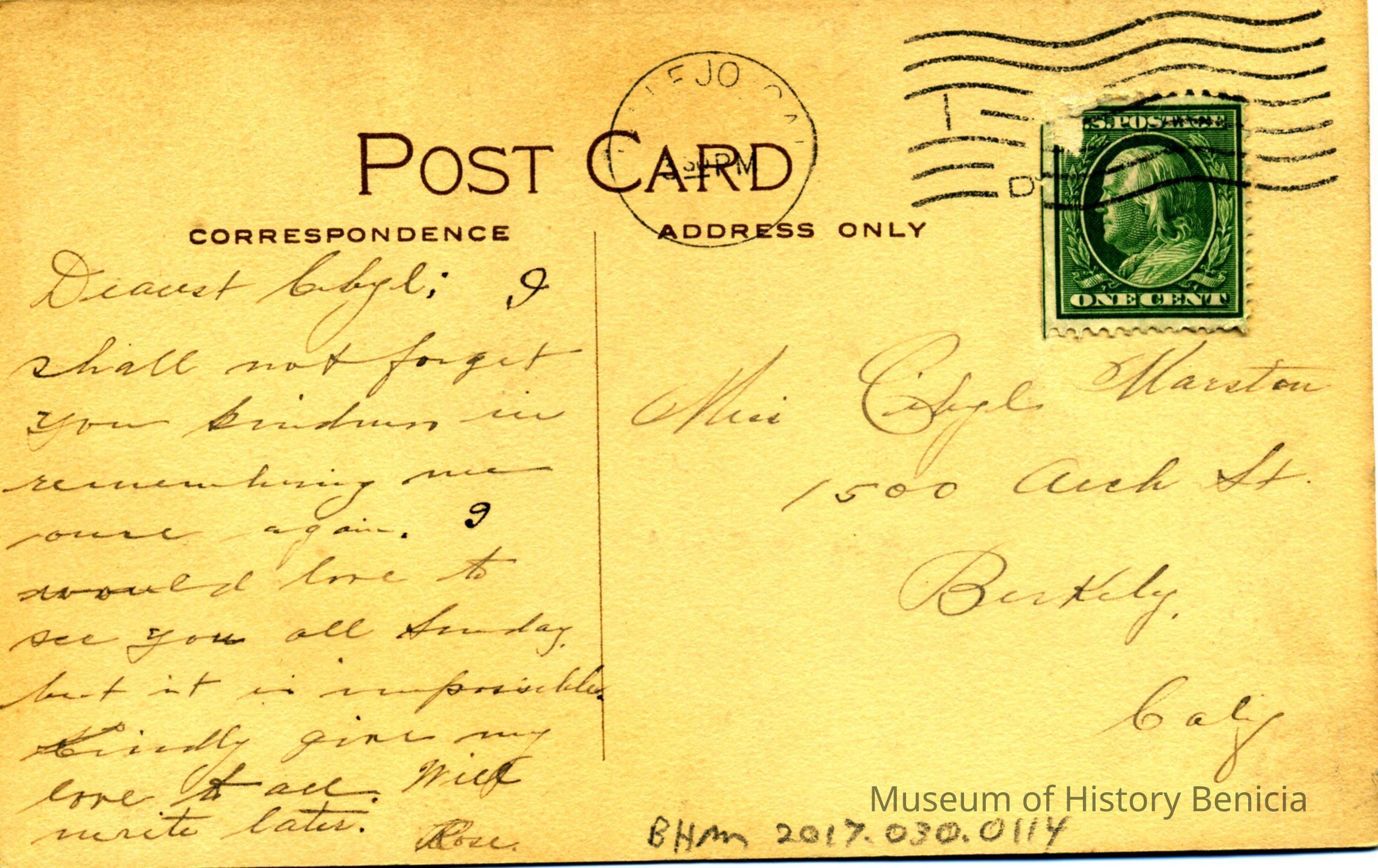 This is a divided back postcard of the Vallejo Commercial Bank in Vallejo. The card is published by Frank J. Stumm No. 9940. It is addressed to Miss Cibpl Marston in Berkely. It is thanking her for her kindness. It is signed by Rose.Collection