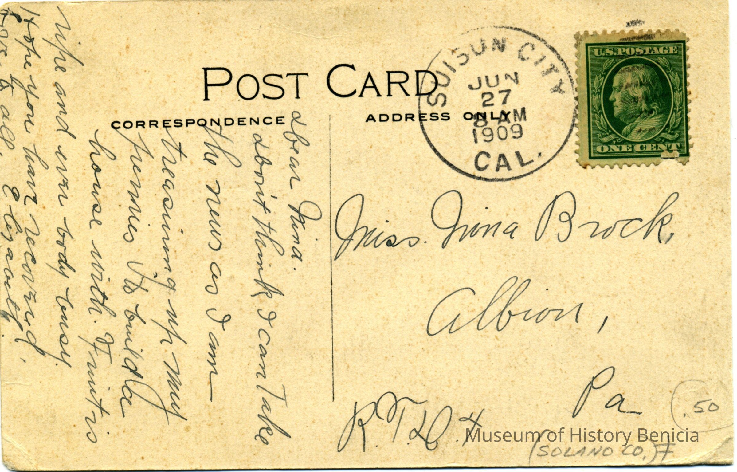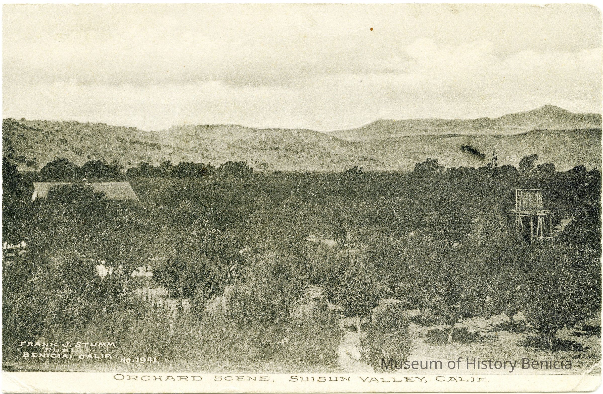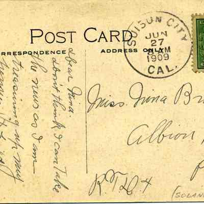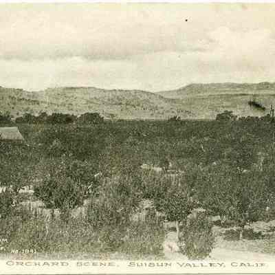 This is a divided back postcard of an orchard in Suisun, CA. It is published by Frank J. Stumm of Benicia. The back is addressed to Miss Nina Brock of Albion, PA. Message is about family stuff.Collection