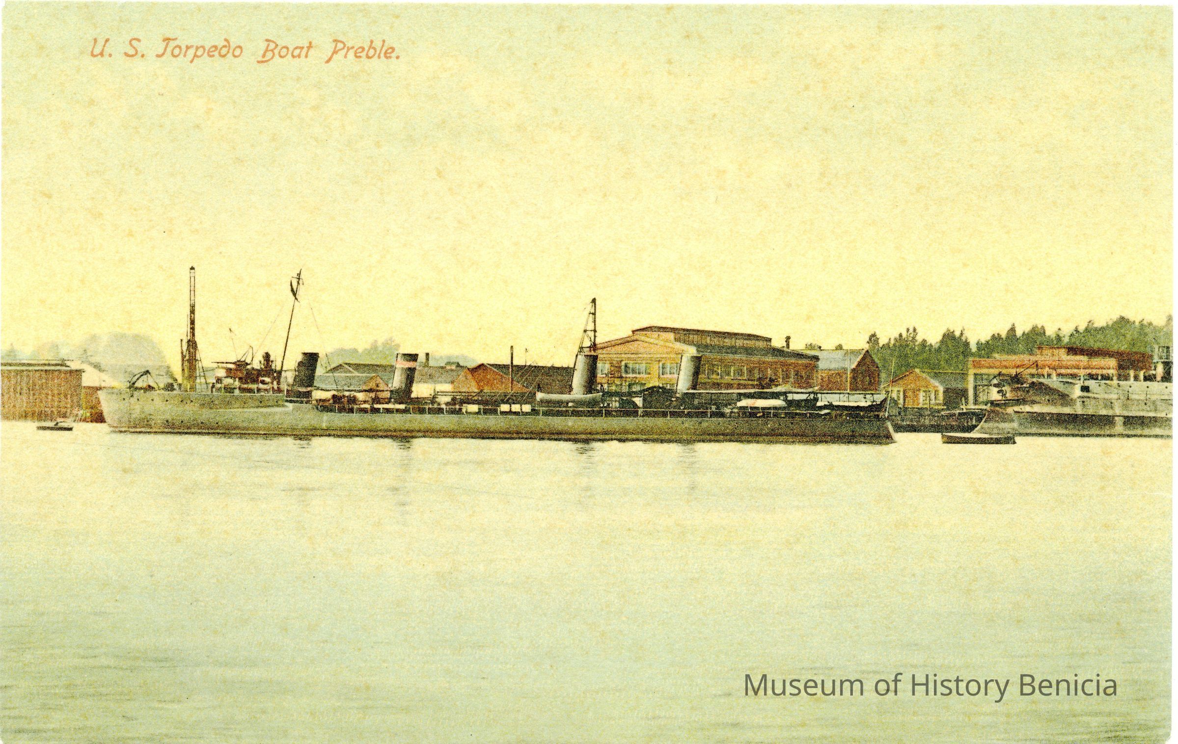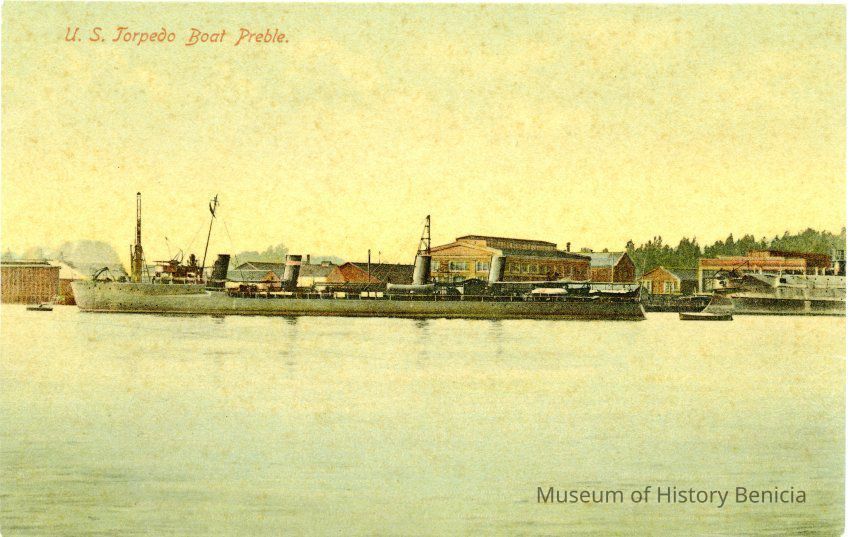 This is a divided back colorized postcard. The photo is of the U.S. Torpedo Boat called the Preble at Mare Island. It was published by Frank J. Stumm of Benicia. The back is blank.