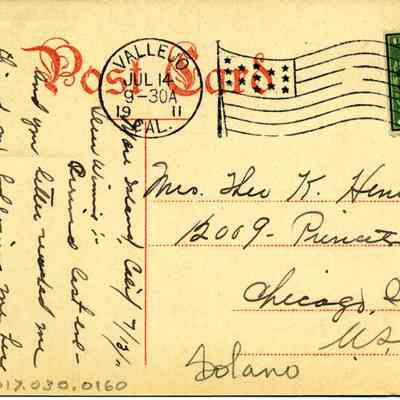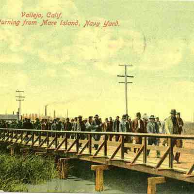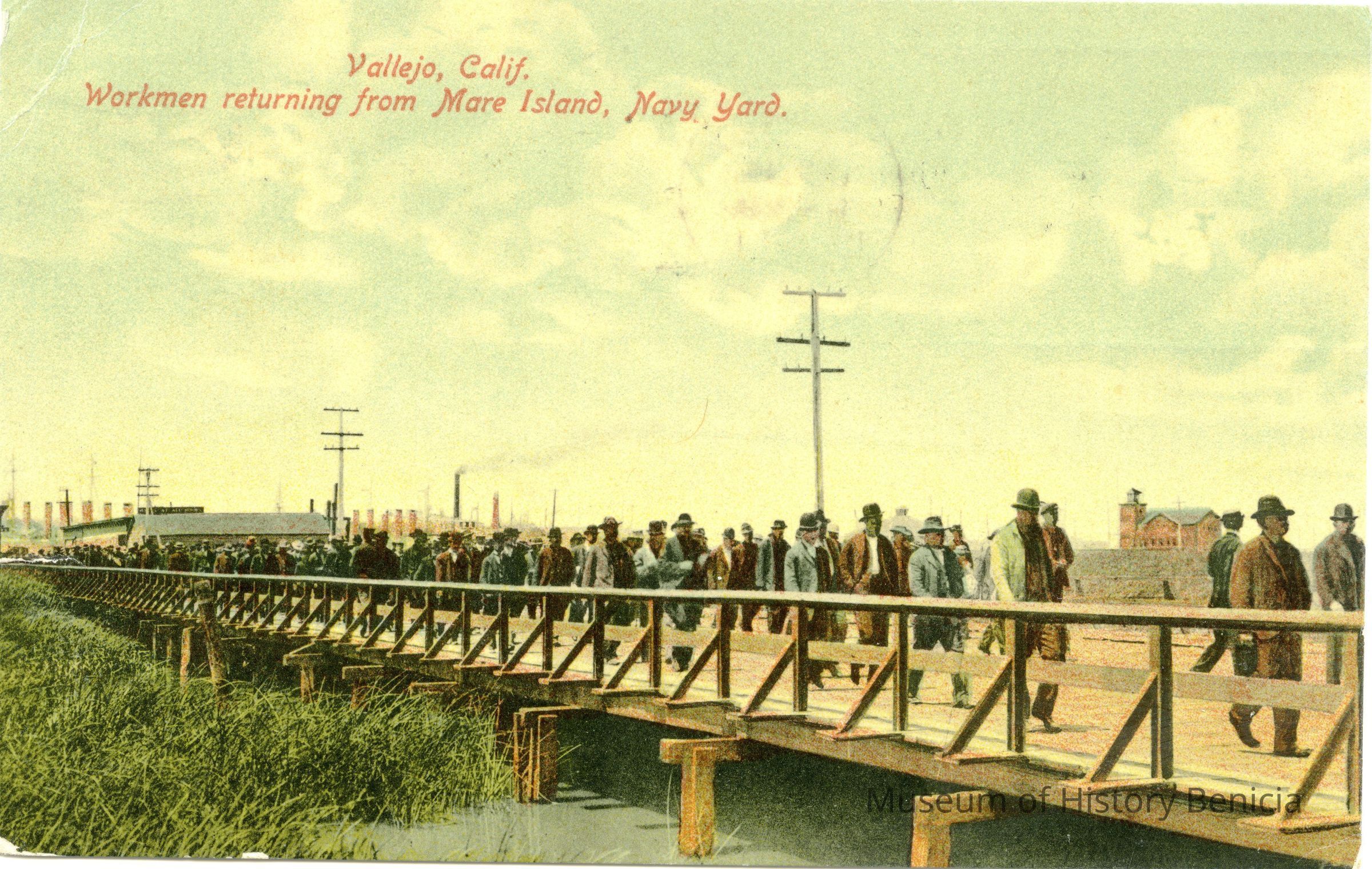 This is a divided back colorized postcard. The photo is of workmen returning from the Mare Island Navy Yard. It was published by Frank J. Stumm of Benicia. The back is addressed to Mrs. Theo K. Hendrick of Chicago, Il. The message is just confirming that the writter has arrived safely.Collection